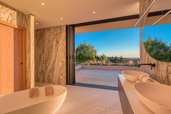 Sie bietet 506 m² Wohnfläche innerhalb einer gärtnerisch gestalteten Anlage von über 6.600 m². Ihre elegante Architektur betont horizontale Formen, offene Volumen und eine ständige Verbindung mit der umliegenden Natur und dem Meereshorizont durch breite Fenster, die natürliches Licht in die Räume fluten.