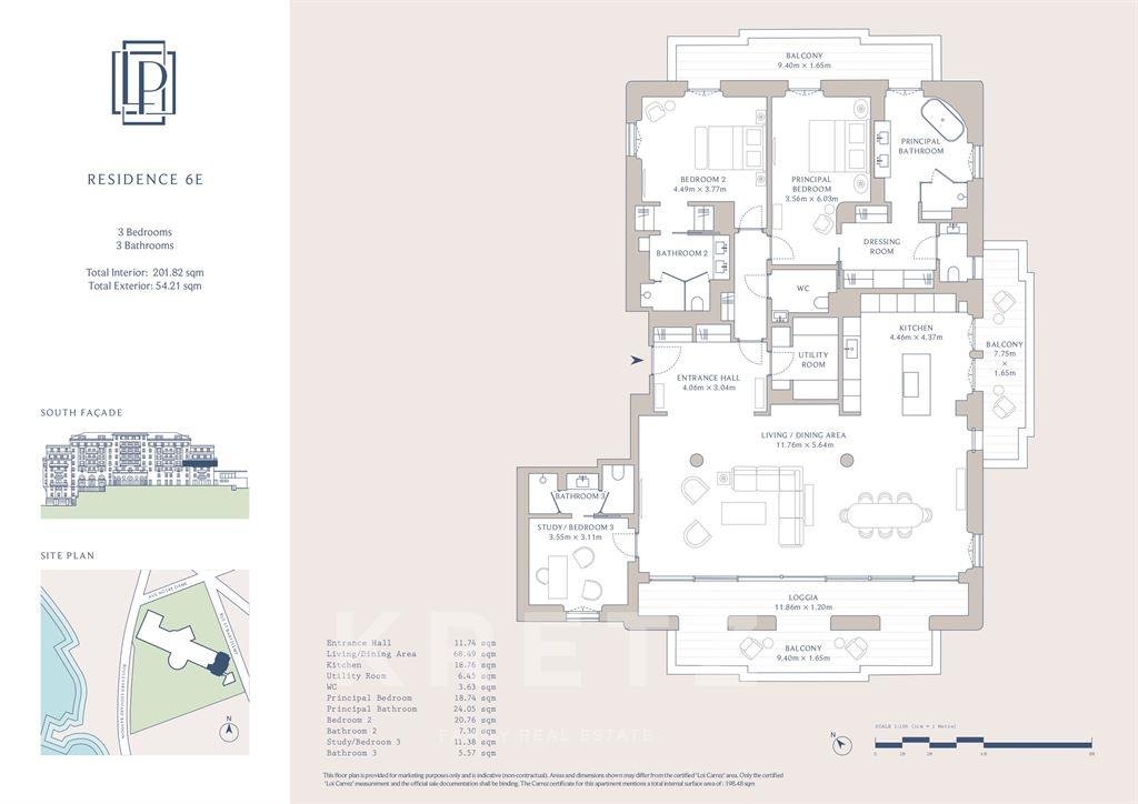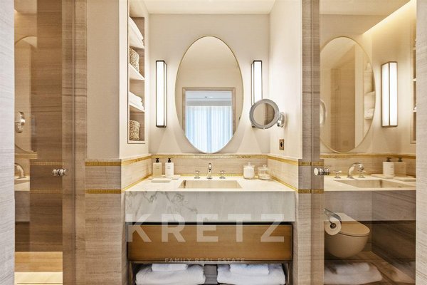 Der Empfangsbereich umfasst 87 m² mit Wohnzimmer, Esszimmer und voll ausgestatteter offener Küche, lichtdurchflutet und geöffnet zu einer Loggia und einem Balkon. Die breiten Schiebetüren schaffen eine perfekte Kontinuität zwischen Innen- und Außenbereich.