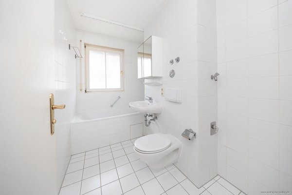 Rechterhand befindet sich das hell geflieste Tageslichtbad, das mit einer Badewanne, Waschbecken und WC ausgestattet ist. Ein Fenster sorgt für angenehmes Tageslicht und natürliche Belüftung. Darüber hinaus bietet das Bad ausreichend Platz für eine Waschmaschine und einen Trockner.