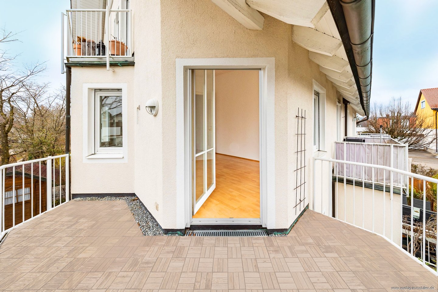 Über eine bodentiefe Tür gelangen Sie auf den ca. 9 m² großen Süd-/Westbalkon. Dank seiner vorteilhaften Ausrichtung begleitet Sie die Sonne über den Tag hinweg und macht den Balkon zu einem wunderbaren Rückzugsort im Freien. Ob gemütliche Sitzecke, kleiner Loungebereich oder bepflanzte Oase – hier eröffnen sich zahlreiche Gestaltungsmöglichkeiten. Der Blick schweift dabei ruhig und grün über die gepflegten Gärten der umliegenden Wohnhäuser. Ein stattlicher Baum im Garten des Hauses sorgt zusätzlich für angenehmen Sichtschutz und unterstreicht die private, geschützte Atmosphäre.