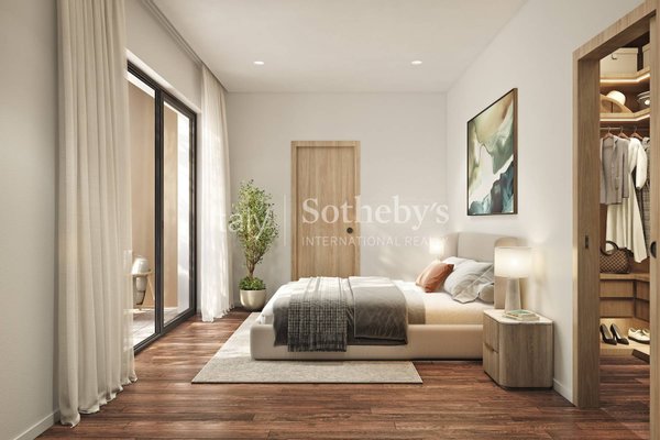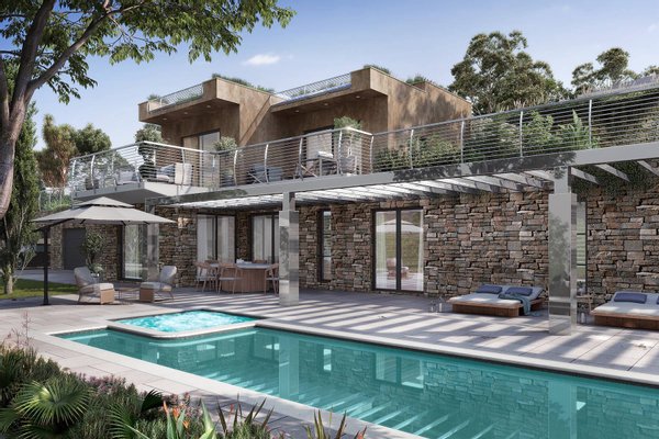Der Eingangsbereich ist von eleganten Grünflächen umgeben und umfasst eine großzügige Garage, den Pool mit Poolhaus sowie den Haupteingang zur Villa. Im Erdgeschoss befinden sich ein weitläufiger Wohnbereich, eine separate Küche und ein Badezimmer. Das Obergeschoss beherbergt die luxuriöse Master-Suite mit eigenem Bad, zwei weitere Schlafzimmer und ein zusätzliches Badezimmer.
