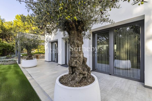 The villa embodies the best of contemporary design, with large and bright spaces that combine functionality and style. The kitchen, tastefully furnished and equipped with the latest appliances, opens onto a refined living room, ideal for moments of conviviality. Outside, an open-air kitchen invites you to enjoy the mild climate of the Riviera between dinners at sunset and days of relaxation. The private garden is an oasis of peace, enriched by centuries-old olive trees and fruit trees, while the equipped roof terrace of 200 mq (2,150 sq ft) offers a perfect space to relax while admiring the view of the sea and the hills. Designed to offer maximum comfort, the villa offers exclusive services such as an outdoor sauna, Turkish bath, hot tub and gym. An advanced Smart Home system guarantees intuitive management of lights, temperature and security, while a cutting-edge surveillance system ensures privacy and tranquility.