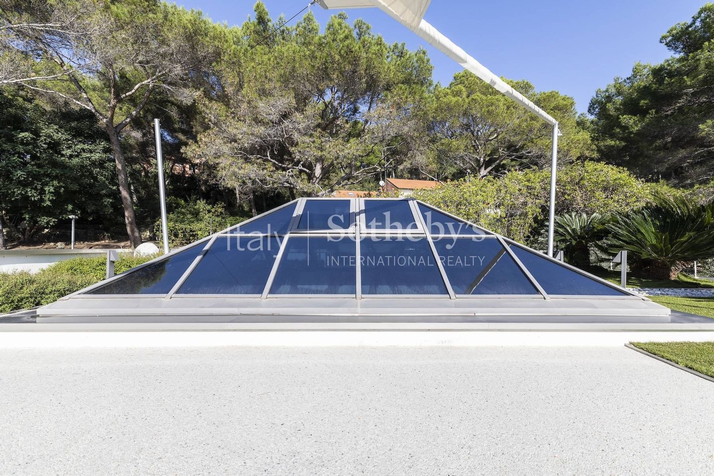 Located in the renowned town of Pinamare, this exclusive villa is immersed in a setting of extraordinary beauty, a few steps from the sea and with privileged connections to Monaco, Nice airport, Genoa and Milan.