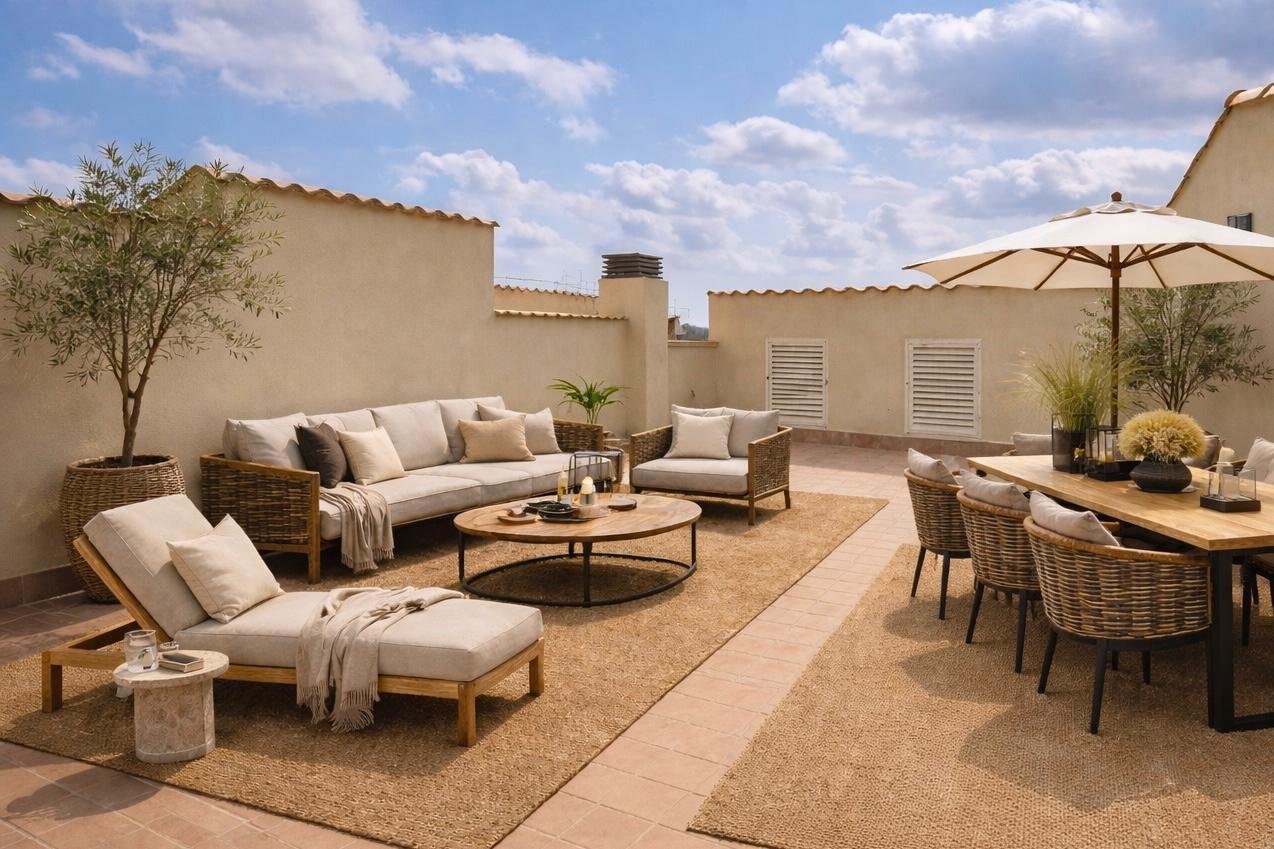 Ein besonderes Highlight ist die ca. 47 m² große Dachterrasse mit BBQ-Bereich – perfekt für gesellige Abende und mediterranes Lebensgefühl.