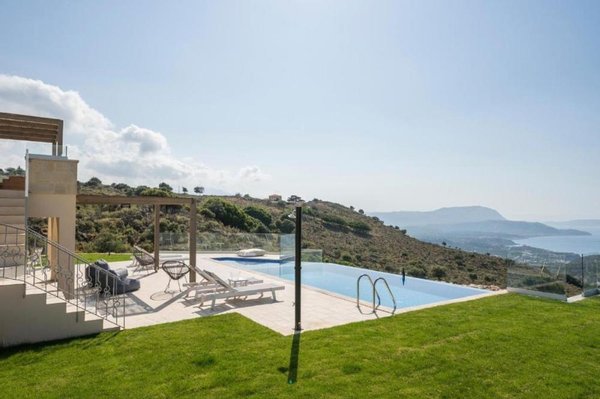 Exklusive Steinvilla in Drapanos mit Panoramablick auf die Souda-Bucht und die Weißen Berge. Sie verfügt über einen 42 m² großen Infinity-Pool, einen angelegten Garten, drei Schlafzimmer und ein separates 54 m² großes Apartment zur Vermietung. Nur 10