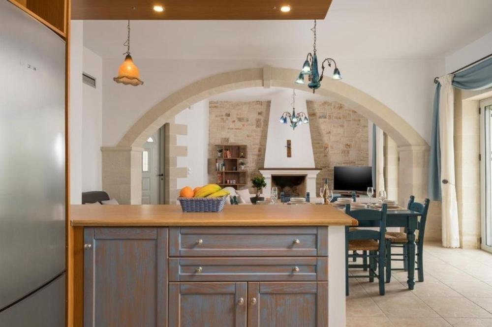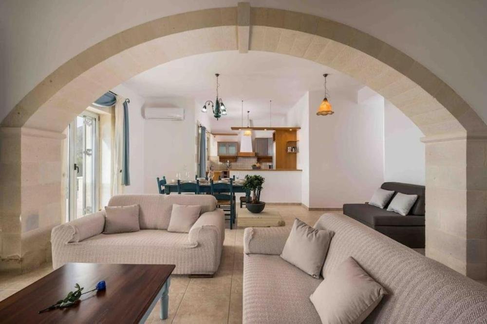 Diese renovierte Steinvilla liegt in einer ruhigen Wohngegend von Drapanos, 30 km östlich von Chania, auf einem erhöhten, 1.245,42 m² großen Grundstück mit Panoramablick über die Souda-Bucht, das Kretische Meer und die Weißen Berge. Der doppelte Blick auf Meer und Berge bietet ganzjährig einen atemberaubenden Anblick und steigert sowohl die Attraktivität als auch die Vermietungschancen.