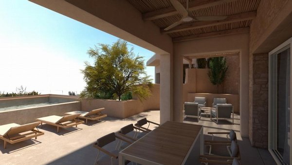 Der Außenbereich steht im Mittelpunkt des Designs. Jede Villa verfügt über einen 18 m² großen privaten Pool mit maßgefertigter Abdeckung, einen angelegten Garten mit klimaangepassten Pflanzen, geflieste Terrassen, Holzpergolen im Vorder- und Hintergarten, eine Außendusche und einen schattigen Privatparkplatz. Die Ausrichtung maximiert den Lichteinfall und den weiten Ausblick: im Norden auf das Kretische Meer, im Südosten auf die Weißen Berge und im Osten über die Dörfer bis hin nach Chania.