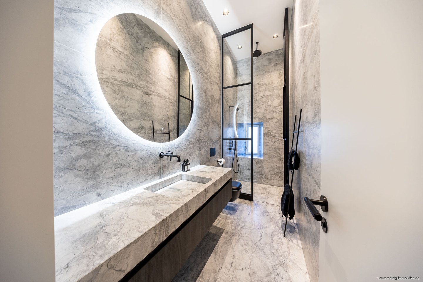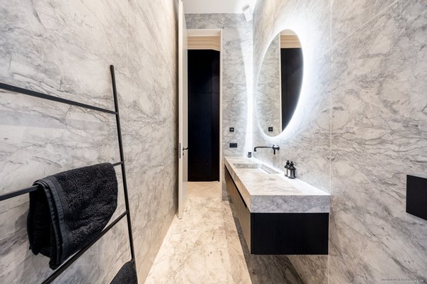 Das hochwertig ausgestattete Tageslichtbadezimmer besticht durch seine exklusive, einmalige Ausstattung. Eine elektrische Fußbodenheizung sorgt für angenehme Wärme, während der praktische beheizbare Spiegel mit individuell regulierbarer Beleuchtung ein stimmungsvolles Ambiente schafft. Der maßgefertigte Schreinerunterschrank mit dezent integrierten Steckdosen verbindet Funktionalität mit elegantem Design und wird durch hochwertige, schwarze „Gessi“-Armaturen ergänzt. Die bodengleiche Regendusche mit umlaufendem Duschablauf von „Bacqua“ und eleganter Glasabtrennung von „De Rooy“ fügt sich harmonisch in das Gesamtbild ein. Vom Boden bis zur Decke verlegte, großformatige "Calacatta-Superwhite" Marmorplatten mit satinierter Oberfläche schaffen eine eindrucksvolle räumliche Tiefe.
