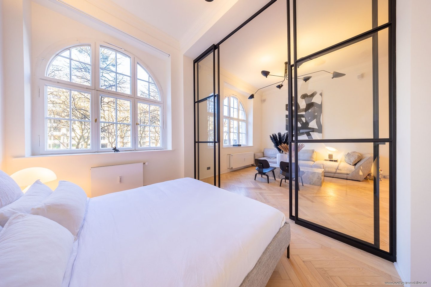 Das angrenzende Schlafzimmer bildet einen ruhigen Rückzugsort und ist über eine elegante, deckenhohe, eingepasste Glasschiebetür harmonisch vom Wohnbereich separiert. Auch hier sorgt ein großzügiges Bogenfenster mit Westausrichtung für eine angenehme Belichtung bis in die Abendstunden. Elektrische Blackout-Rollos im Wohn-/ und Schlafzimmer gewährleisten maximale Privatsphäre und ermöglichen Ihnen zu jeder Tageszeit einen erholsamen Schlaf.