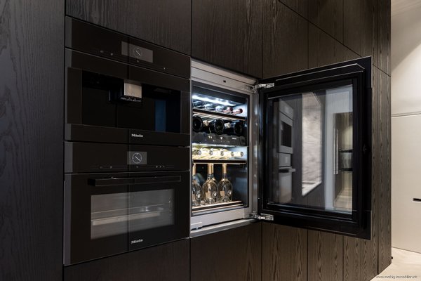 Am Ende des Flures empfängt Sie die offen gestaltete Küche und setzt diesen hohen Anspruch konsequent fort. Hochwertige „Miele“-Einbaugeräte ebenso wie ein modernes „Bora“-Kochfeld mit integriertem Dunstabzug fügen sich nahtlos in die edle Gestaltung ein. Der „Quooker“-Wasserhahn bietet Ihnen gefiltertes oder sprudelndes Wasser direkt auf Knopfdruck. Ergänzt wird das Ensemble durch eine automatische, selbstreinigende Kaffeemaschine, einen Backofen mit Garfunktion sowie einen Weinkühlschrank mit zwei Temperaturzonen.