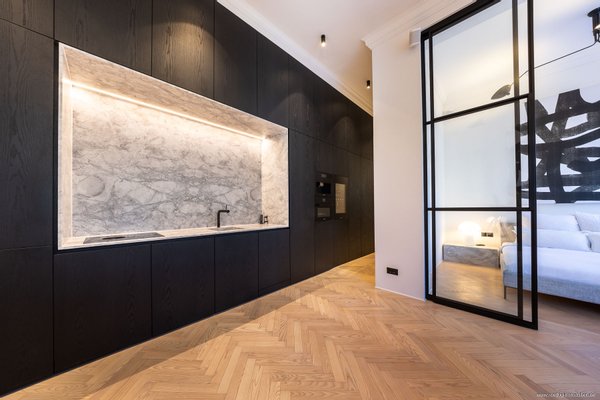 Auch im Alltag überzeugt die Küche mit Ihren durchdachten Details: Ein Gefrierschrank mit Ice-Maker, ein Waschtrockner mit Waschmitteldosierung, ein integrierter Wäschesortierer sowie eine elegante Staubsaugerstation mit eigener Steckdose sind perfekt und dezent integriert. Die großzügige Arbeitsfläche aus edlem Marmor – abgestimmt auf die anderen Räumlichkeiten der Wohnung – beherbergt flächenbündig eingelassene Steckdosen sowie eine geschickt integrierte Beleuchtung.