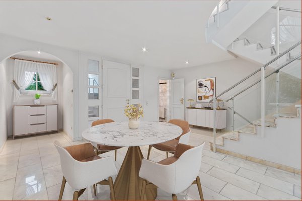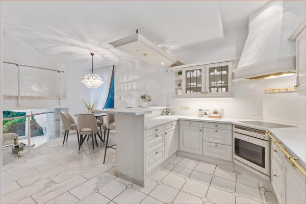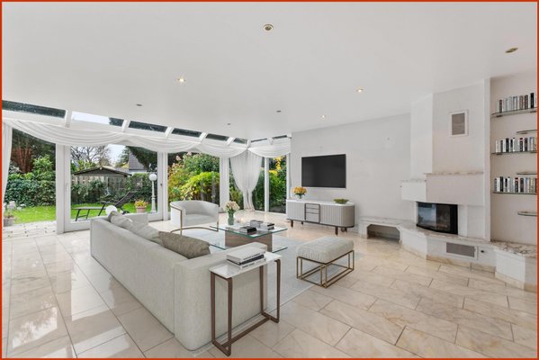 Ein hochwertiger Marmorboden prägt die zentralen Wohnebenen und unterstreicht den zeitlosen Charakter der Immobilie. Das großzügige Wohnzimmer mit großer Fensterfront sorgt für viel Tageslicht und wird durch einen geschlossenen Kamin stimmig ergänzt.