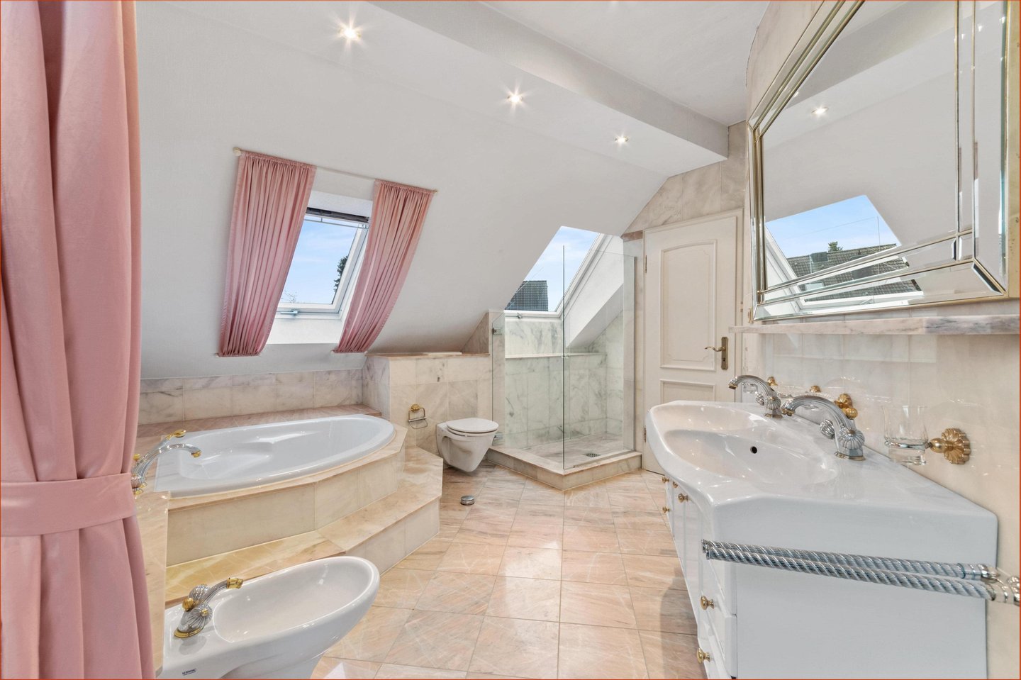 Im Dachgeschoss liegt das Schlafzimmer mit integrierter Schranklösung. Das Tageslichtbad im Spitzboden verfügt über eine Eckbadewanne, eine großzügige Walk-in-Dusche, Doppelwaschbecken sowie WC und Bidet. Ein zusätzlicher Raum eignet sich ideal als Arbeits- oder Rückzugsbereich.