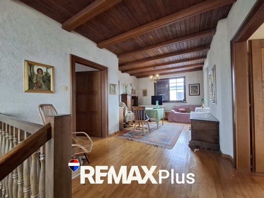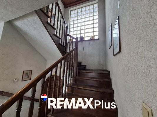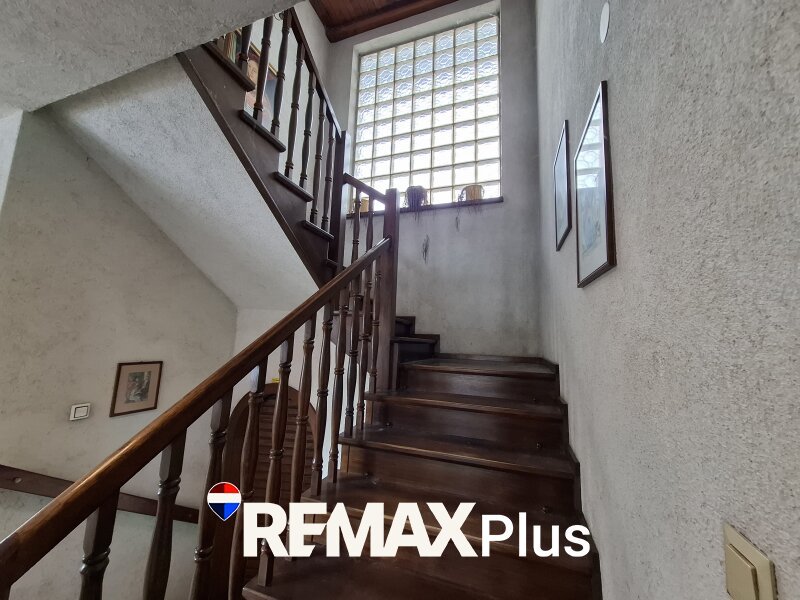 Über eine dunkle Holztreppe – belichtet durch ein großes Fenster im Stiegenhaus – erreicht man sowohl das Obergeschoss als auch den Keller.