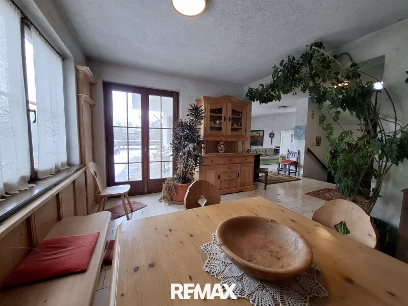 Angrenzend und offen gestaltet befindet sich der Essbereich, ebenfalls mit Zugang zur Terrasse. Über einen Holzbogen gelangt man in die vollmöblierte Küche in dunkler Holzoptik, die funktional ausgestattet ist.