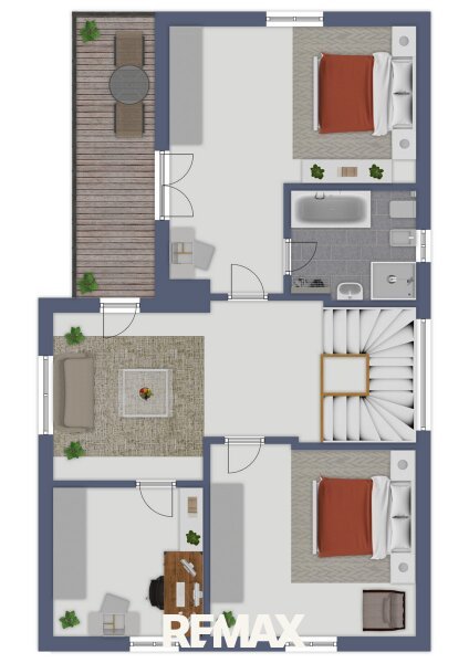 Im Obergeschoss befindet sich eine großzügige Diele, von der aus sämtliche Räume zentral begehbar sind. Hier stehen zwei Schlafzimmer zur Verfügung. Eines der Schlafzimmer verfügt über ein eigenes Badezimmer mit Badewanne und WC sowie einen direkten Zugang zum Balkon.