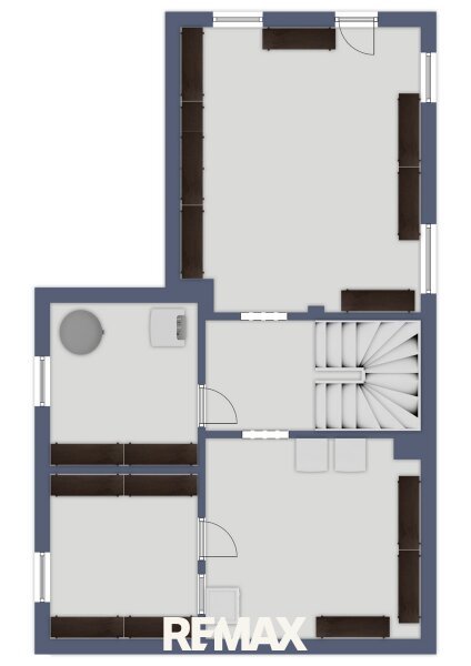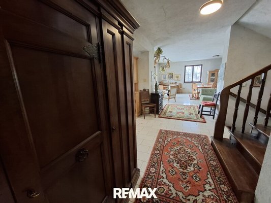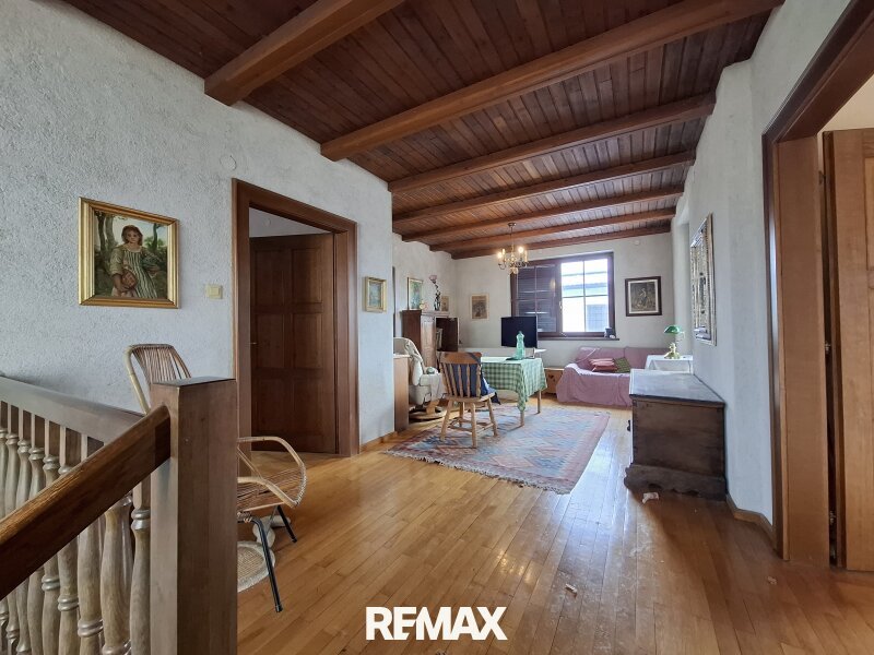 Über eine dunkle Holztreppe – belichtet durch ein großes Fenster im Stiegenhaus – erreicht man sowohl das Obergeschoss als auch den Keller.