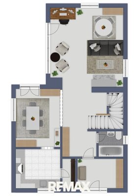 Der Zugang zum Haus erfolgt über eine außenliegende Treppe. Über die Haustür betritt man zunächst einen kleinen Vorraum, der in den offen gestalteten Wohnbereich führt. Das Herzstück des Erdgeschosses bildet das großzügige, lichtdurchflutete Wohnzimmer mit großen Fensterflächen und direktem Zugang zur Terrasse. Ein Kamin sorgt hier für eine angenehme Wohnatmosphäre und bietet eine zusätzliche Heizmöglichkeit.