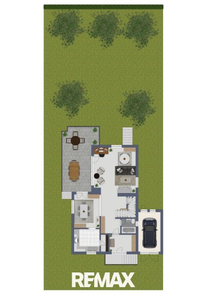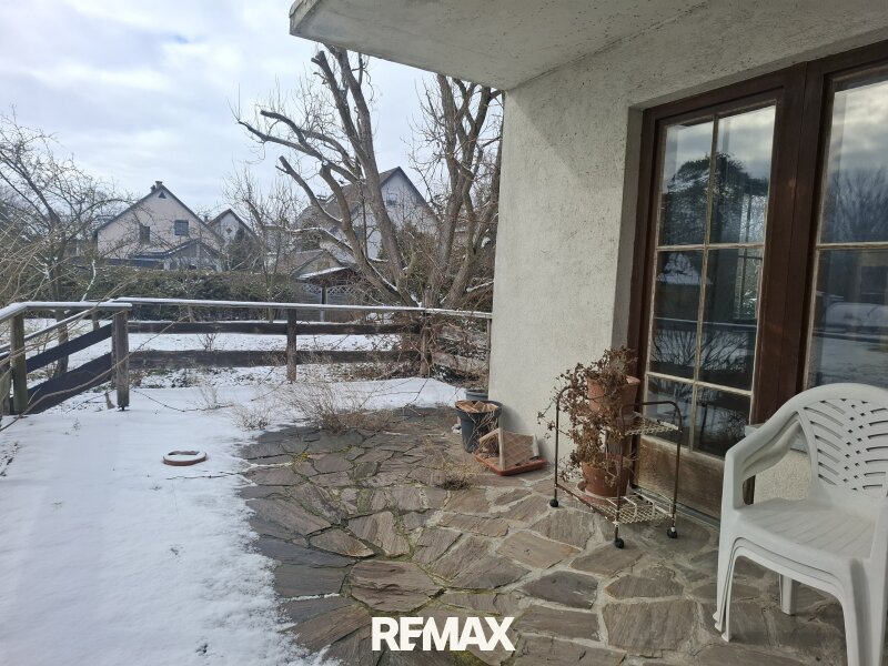 Der Garten präsentiert sich schlicht und pflegeleicht gestaltet. Ein großer Baum in zentraler Lage bildet einen besonderen Blickfang und verleiht dem Außenbereich eine angenehme Atmosphäre. Die Terrasse sowie der Balkon erweitern den Wohnraum ins Freie und bieten ideale Voraussetzungen für entspannte Stunden im Freien.
