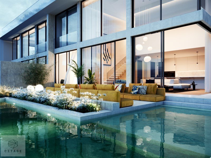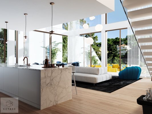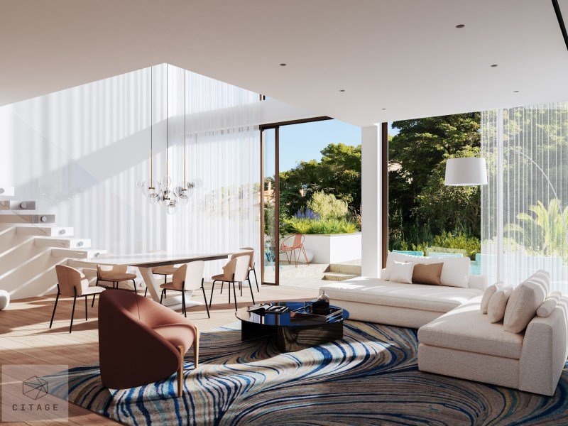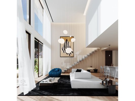 The large living areas, with high ceilings and floor-to-ceiling panoramic windows, create a modern, bright and welcoming atmosphere.