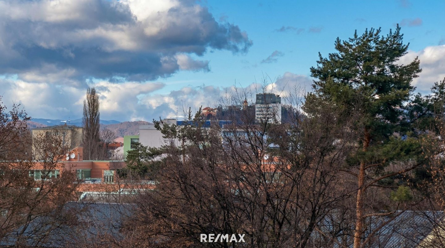 Die südliche Ausrichtung der Wohnung sorgt für eine helle, freundliche Wohnatmosphäre. Ein absolutes Highlight ist die sonnige, ca. 11 m² große Terrasse mit traumhaftem Blick Richtung Schlossberg sowie Fernblick bis zur Koralpe. Hier genießen Sie entspannte Stunden im Freien und ein Panorama, das jeden Tag aufs Neue begeistert. Vom großzügigen Koch-/Wohn-/Essbereich aus haben Sie direkten Zugang auf die herrliche Terrasse.