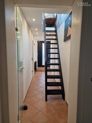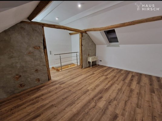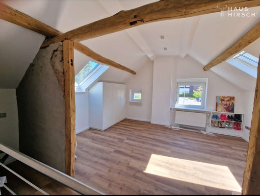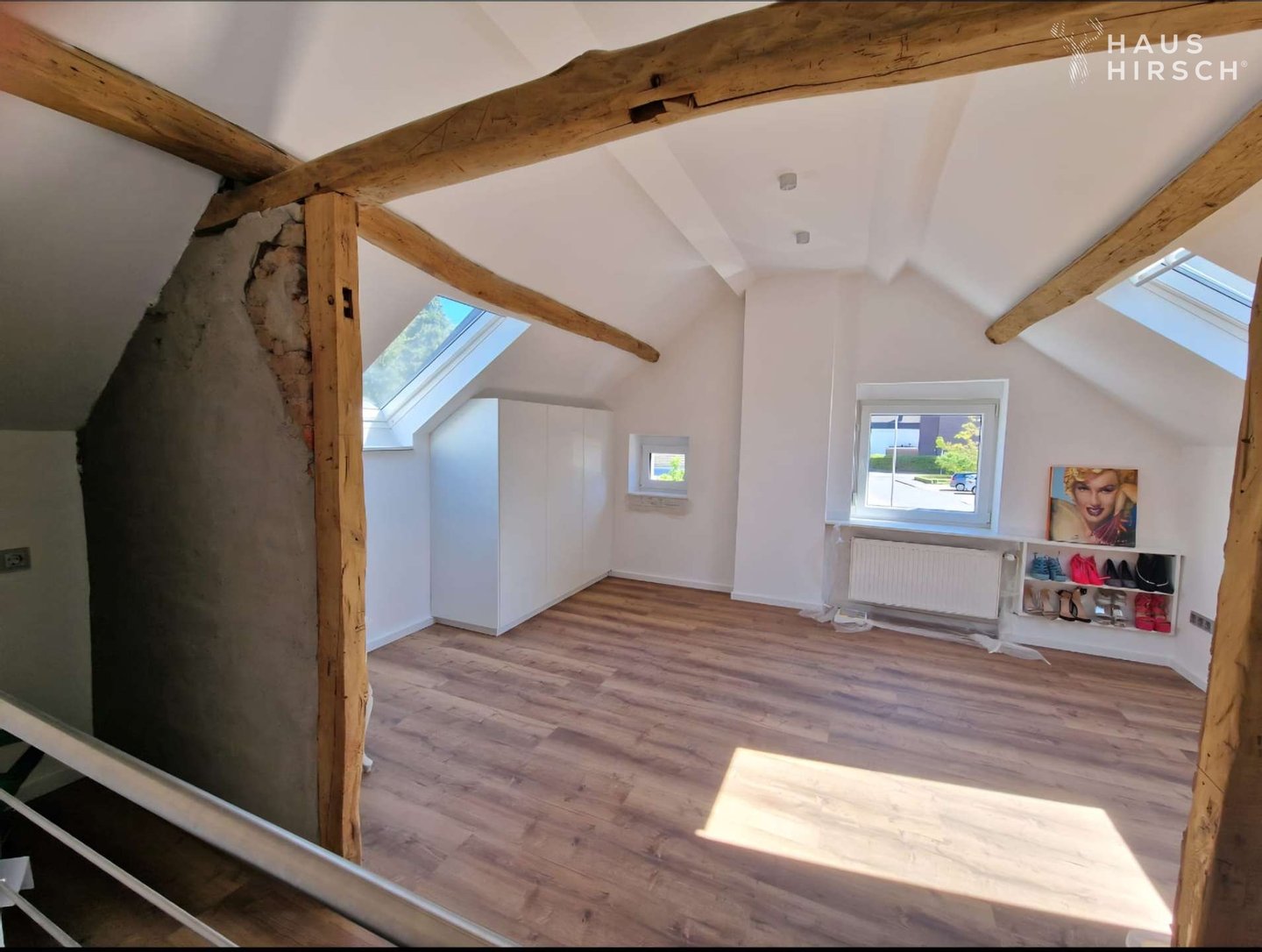 Über die Treppe gelangen Sie ins 1. Obergeschoss, wo sich das helle Arbeitszimmer mit zahlreichen Fenstern befindet. Das Dach wurde 2014 erneuert und ist optimal gedämmt, um für Wärme im Haus zu sorgen.