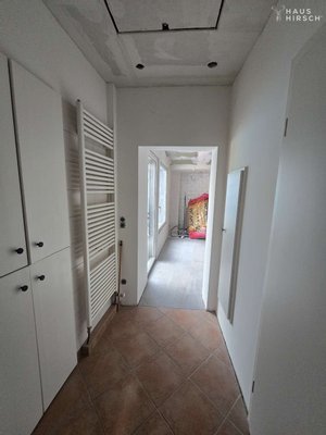 Sie betreten das Haus und gelangen in einen geräumigen Flur. Rechts davon befindet sich das gemütliche Schlafzimmer, während auf der rechten Seite das Badezimmer mit einer bodentiefen Dusche liegt. Eine Nische für Waschmaschine und Trockner bietet