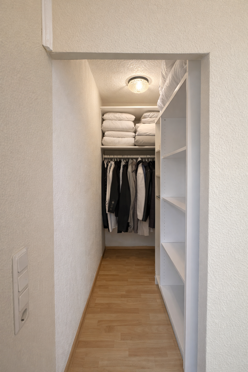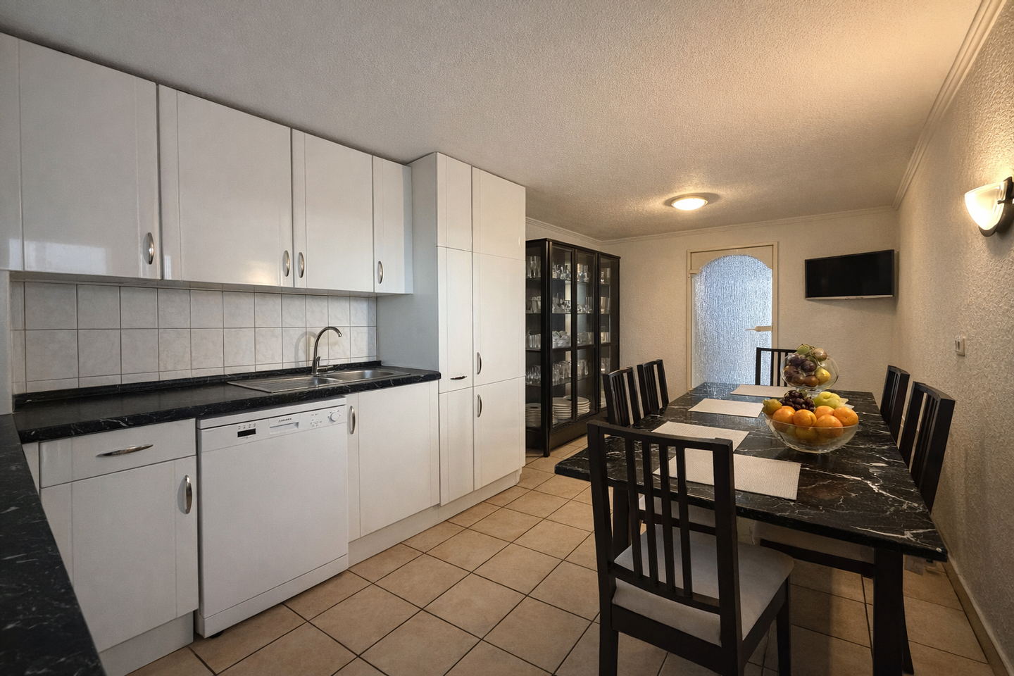Folgt man dem Flur weiter, gelangt man in die Küche, die funktional geschnitten ist und durch einen angrenzenden, großzügigen Abstellraum zusätzlichen Stauraum für Vorräte und Haushaltsutensilien bereithält. Ebenfalls auf dieser Ebene befindet sich ein weiteres Zimmer, das derzeit als Essbereich genutzt werden kann, sich jedoch ebenso hervorragend als Arbeits- oder Gästezimmer eignet – ideal für modernes Wohnen mit Homeoffice-Möglichkeit.