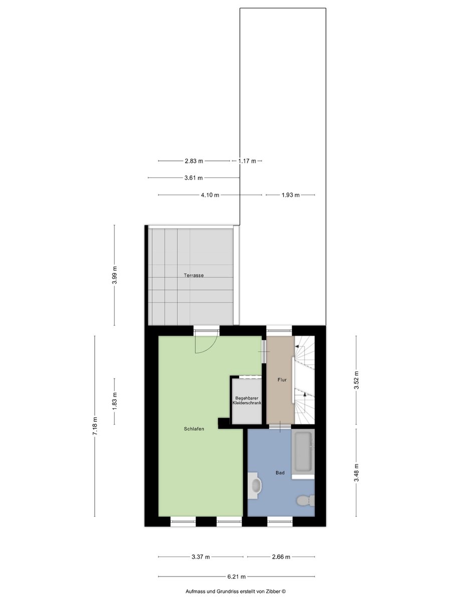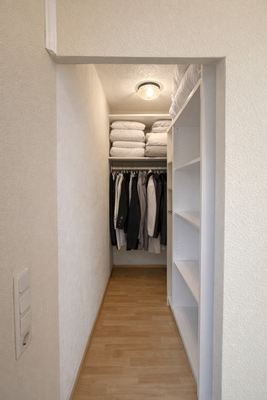 Über eine Holztreppe erreichen Sie das erste Obergeschoss. Hier erwartet Sie ein großzügiges Schlafzimmer mit einem begehbaren Kleiderschrank, der für angenehmen Komfort und Ordnung sorgt. Vom Schlafzimmer aus betreten Sie die Dachterrasse, die einen schönen Blick ins Grüne und in den eigenen Garten bietet – ein privater Rückzugsort für entspannte Stunden. Ergänzt wird diese Etage durch ein geräumiges Badezimmer, das ausreichend Platz für die täglichen Abläufe bietet.