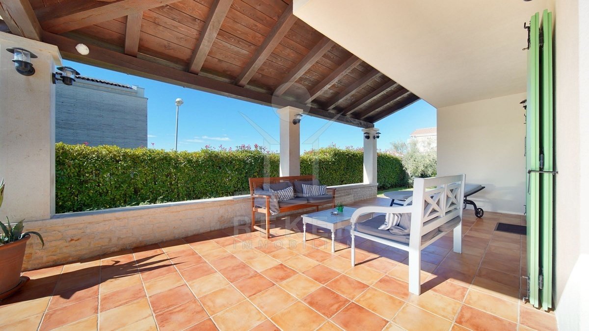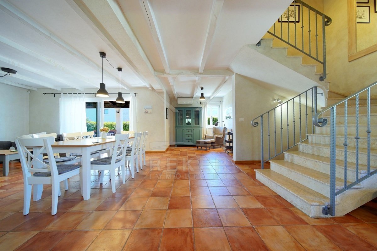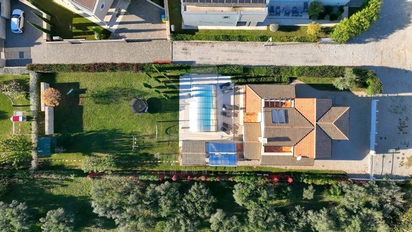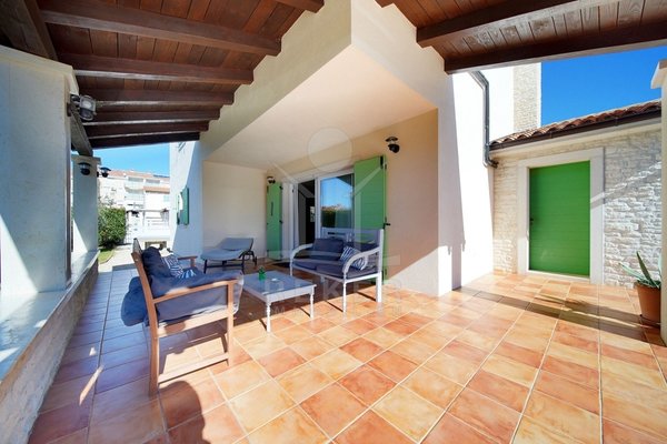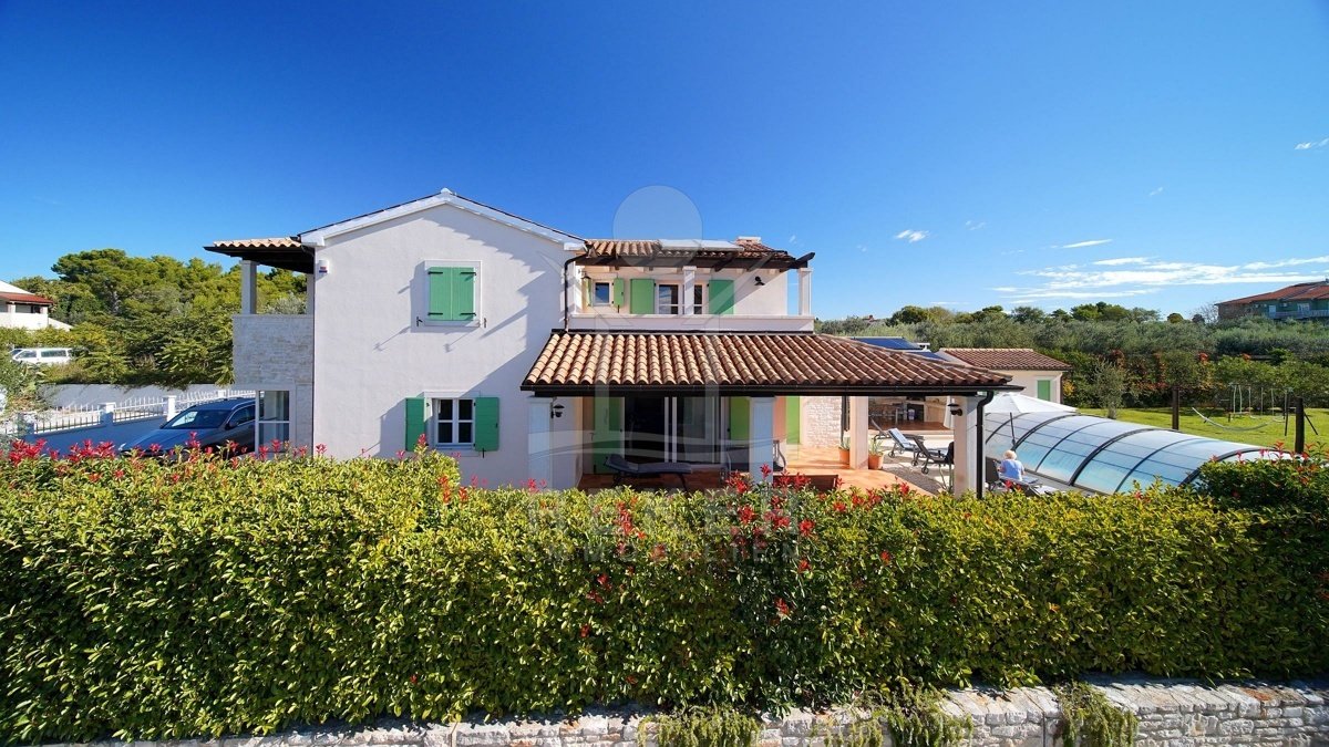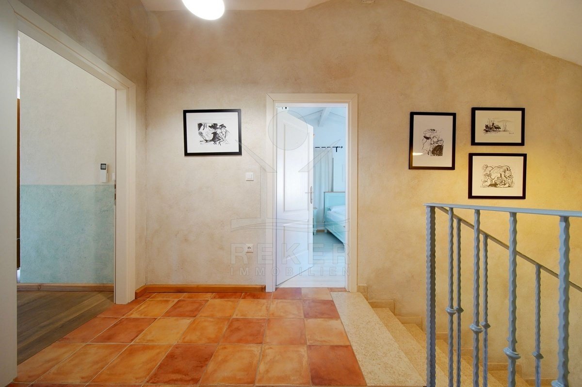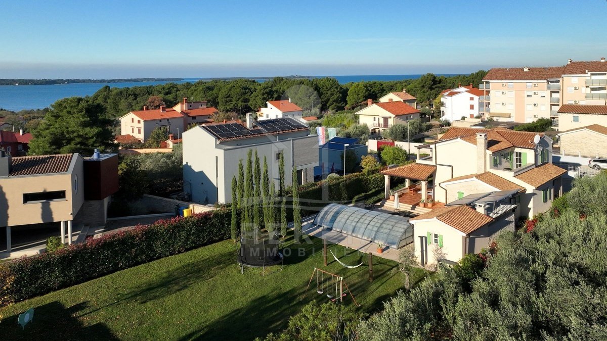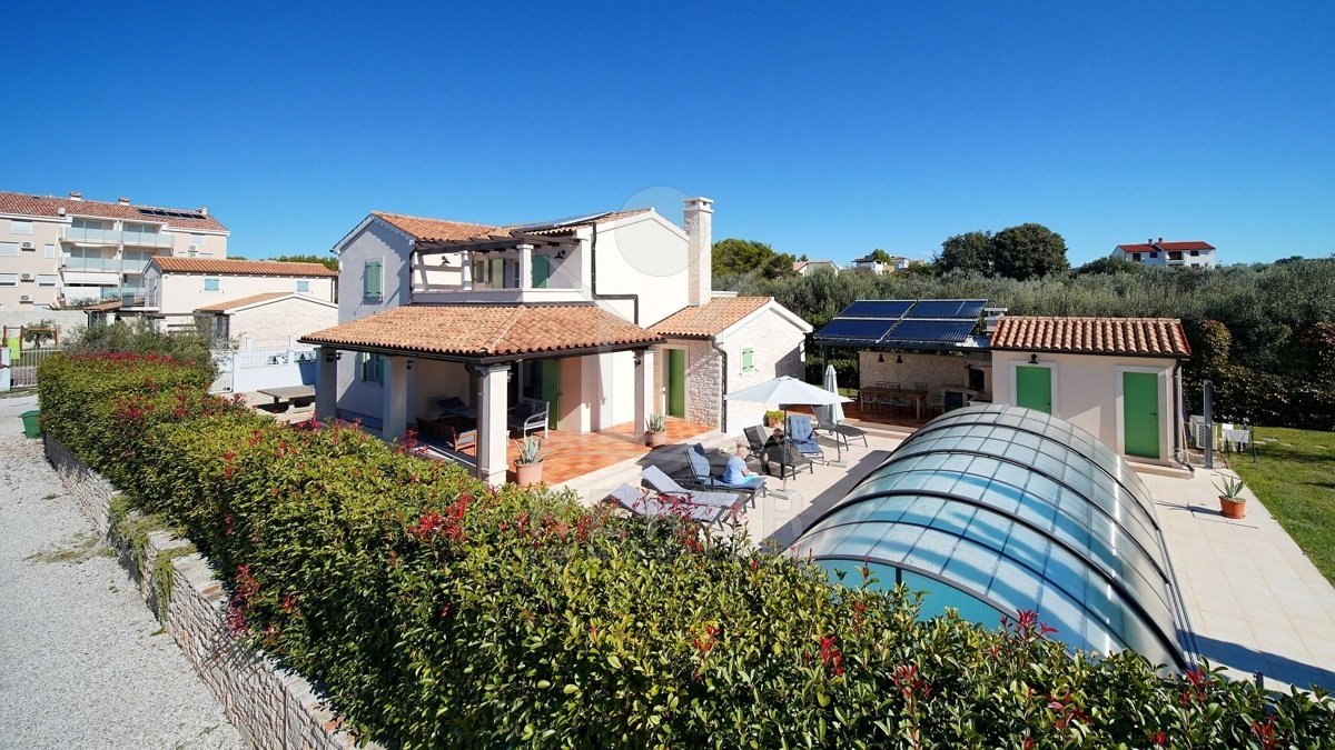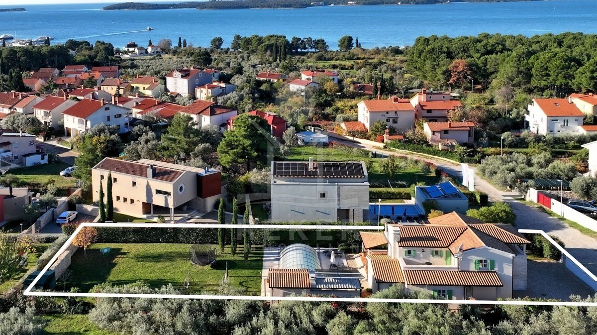 In einem ruhigen Wohnbereich von Fažana, nur rund 600 Meter vom Meer und Strand entfernt, steht diese 2014 erbaute Villa im traditionellen Stil. Sie wohnen angenehm nah an der Küste. Einkaufsmöglichkeiten, Restaurants und Einrichtungen des täglichen Bedarfs erreichen Sie schnell. Die Autobahnauffahrt Vodnjan ist etwa 6 Kilometer entfernt, der Flughafen Pula rund 14 Kilometer. Auf dem Grundstück innerhalb der Bauzone parken Sie drei Fahrzeuge auf eigenem Grund. Ein motorisiertes Einfahrtstor sorgt für zusätzlichen Komfort.