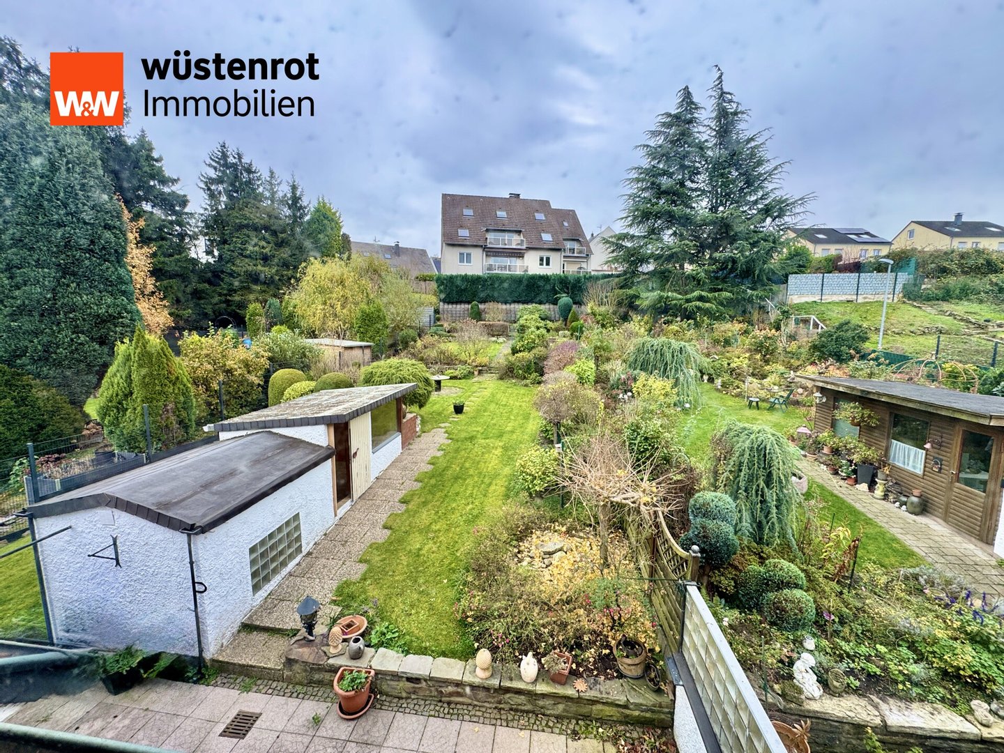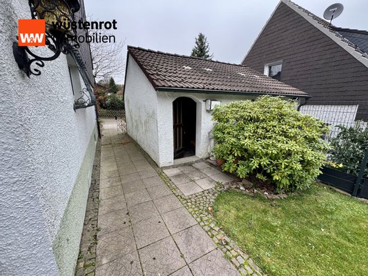 Bereits der Vorgarten vermittelt einen einladenden Eindruck. Auf dem Grundstück befinden sich zudem eine Garage mit angeschlossenem Abstellraum sowie ein Gartenhaus, ausgestattet mit einem Zimmer und einer kleinen Küche – ideal als Hobbyraum, Atelier oder Home-Office.