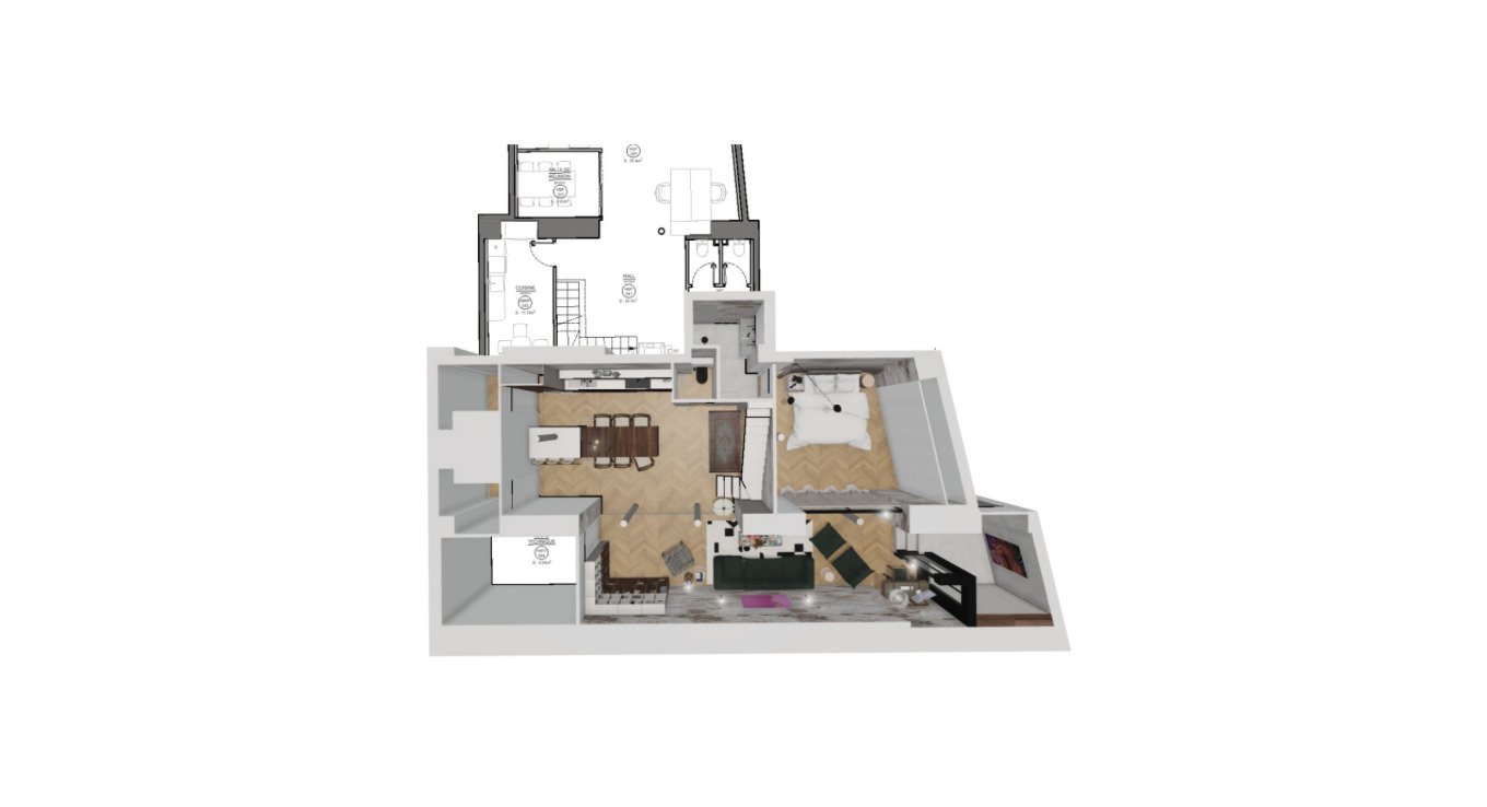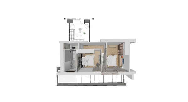 - Wohnraum an einem zweiten Eingang, der vom Hof zurückgesetzt ist (3D-Teile auf den Plänen)