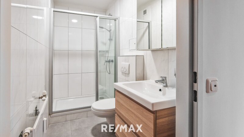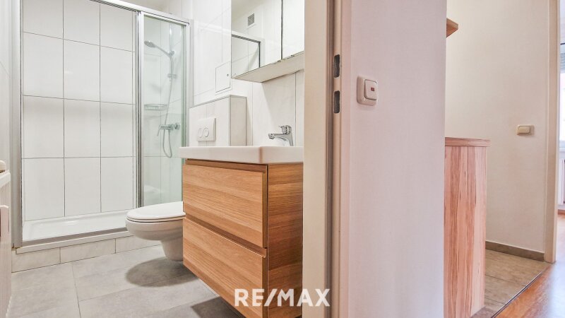 - Badezimmer mit großer Duschkabine, Waschtisch mit Spiegelschrank und WC