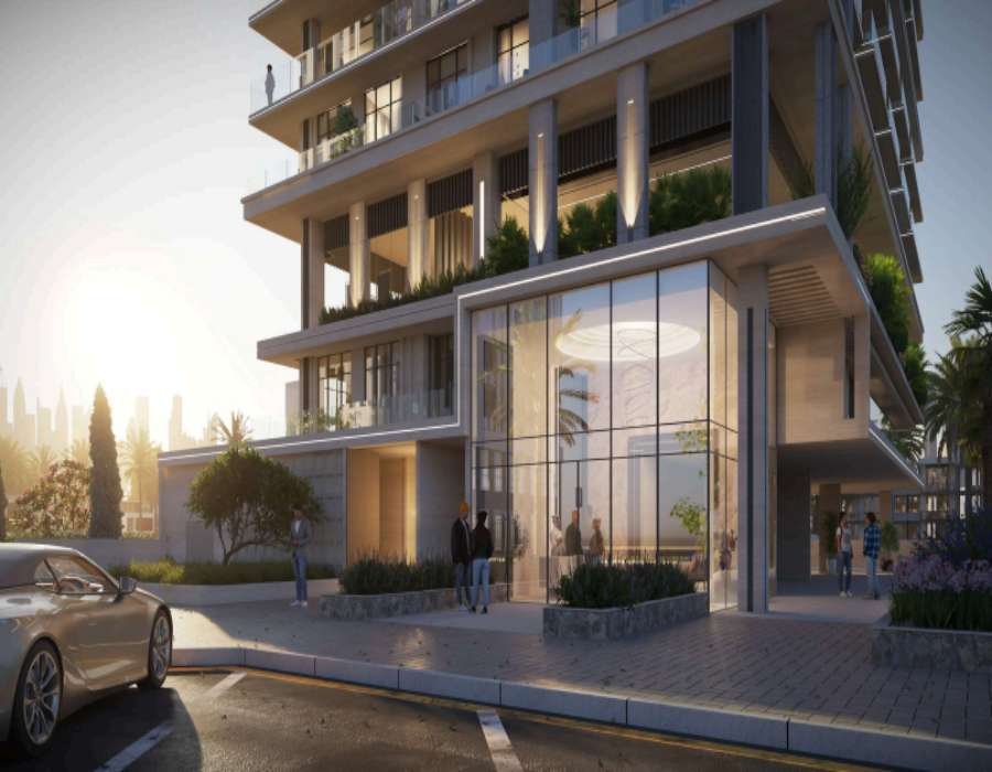 Willkommen in einer modernen Wohnanlage im Dubai Land Residence Complex, die zeitgenössische Architektur mit einem warmen, gemeinschaftsorientierten Wohnerlebnis verbindet. Die Immobilie zeichnet sich durch eine schlichte, symmetrische Fassade und