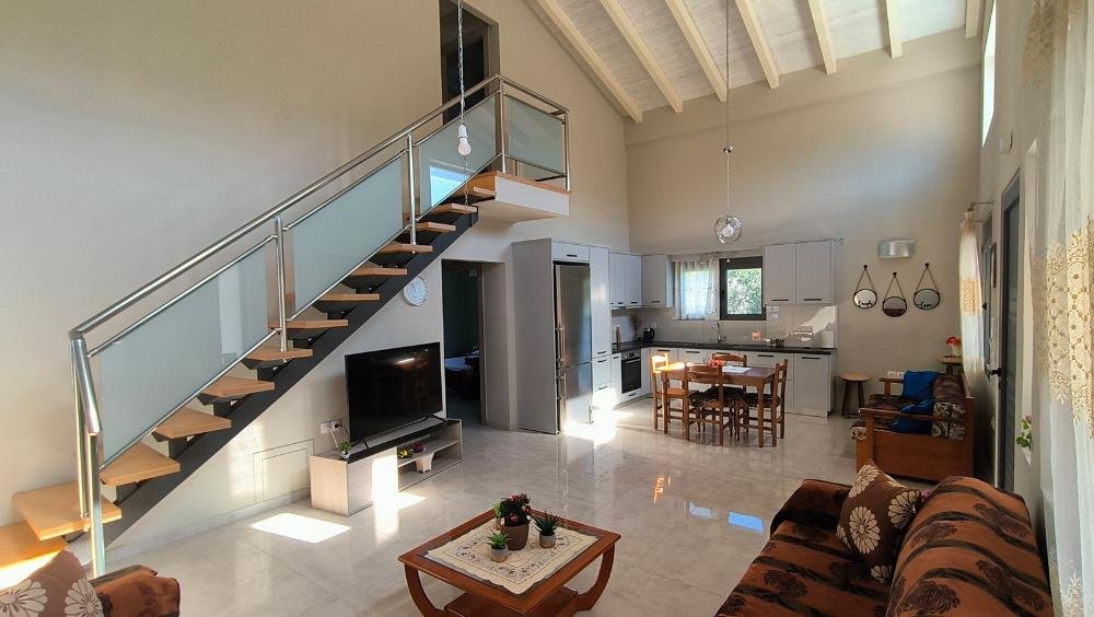Das neu erbaute Haus besticht durch hochwertige Materialien und verfügt über vier Schlafzimmer und zwei Badezimmer. Der helle, offene Wohn-, Ess- und Küchenbereich wird durch hohe Decken und elegante weiße Holzbalken betont. Eine Holztreppe führt ins Obergeschoss mit zwei weiteren Schlafzimmern und einem Badezimmer, die Privatsphäre und Komfort bieten.