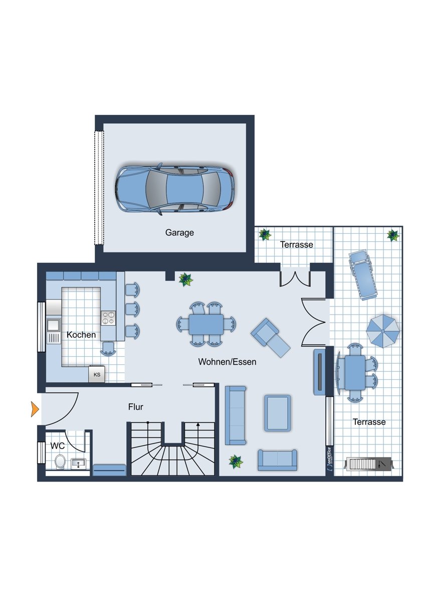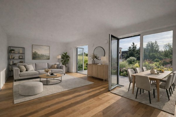 Im Erdgeschoss befindet sich ein großzügiger, lichtdurchfluteter Wohn- und Essbereich mit direktem Zugang zur Südterrasse und in den Garten. Die offene Küche fügt sich harmonisch in den Wohnbereich ein. Ein Gäste-WC sowie die Eingangsdiele mit einer Garderobennische runden das Raumangebot auf dieser Ebene ab.