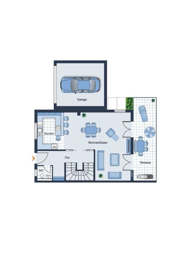 Im Erdgeschoss befindet sich ein großzügiger, lichtdurchfluteter Wohn- und Essbereich mit direktem Zugang zur Südterrasse und in den Garten. Die offene Küche fügt sich harmonisch in den Wohnbereich ein. Ein Gäste-WC sowie die Eingangsdiele mit einer Garderobennische runden das Raumangebot auf dieser Ebene ab.