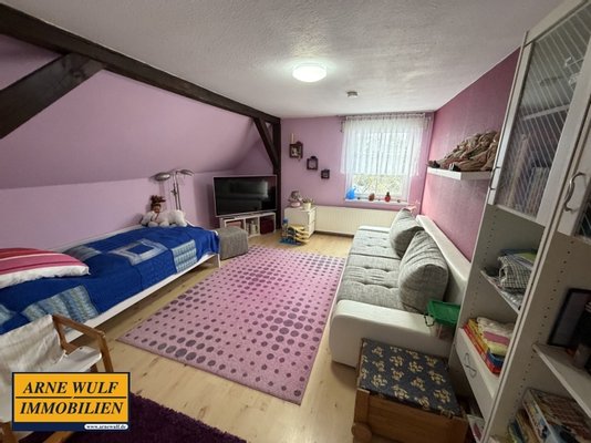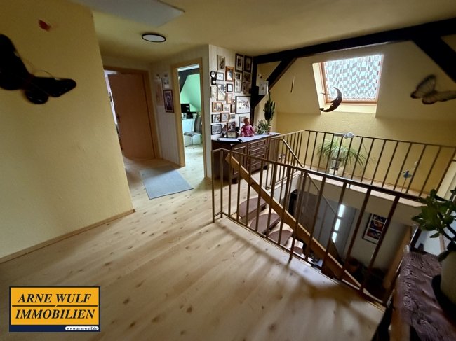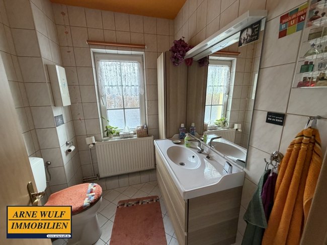 Das Obergeschoss verfügt über weitere Wohnräume, eine Diele sowie ein Badezimmer und bietet ausreichend Platz für Familie, Gäste oder Homeoffice. Die Beheizung erfolgt über eine Gaszentralheizung (Flüssiggas mit gemieteten Erdtank), die Warmwasserversorgung über Durchlauferhitzer. Die zentralen Anschlüsse für Wasser und Energie wurden bereits erneuert, das Abwasser ist zentral angeschlossen. Die Bäder sind hell und funktional gestaltet. Als Bodenbeläge wurden Laminat und Fliesen verlegt. Zum Anwesen gehören ausreichend massives Nebengelass sowie eine Doppelgarage. Das weitläufige Grundstück bietet viel Platz zur Erholung, für Gartenliebhaber oder zur individuellen Nutzung.