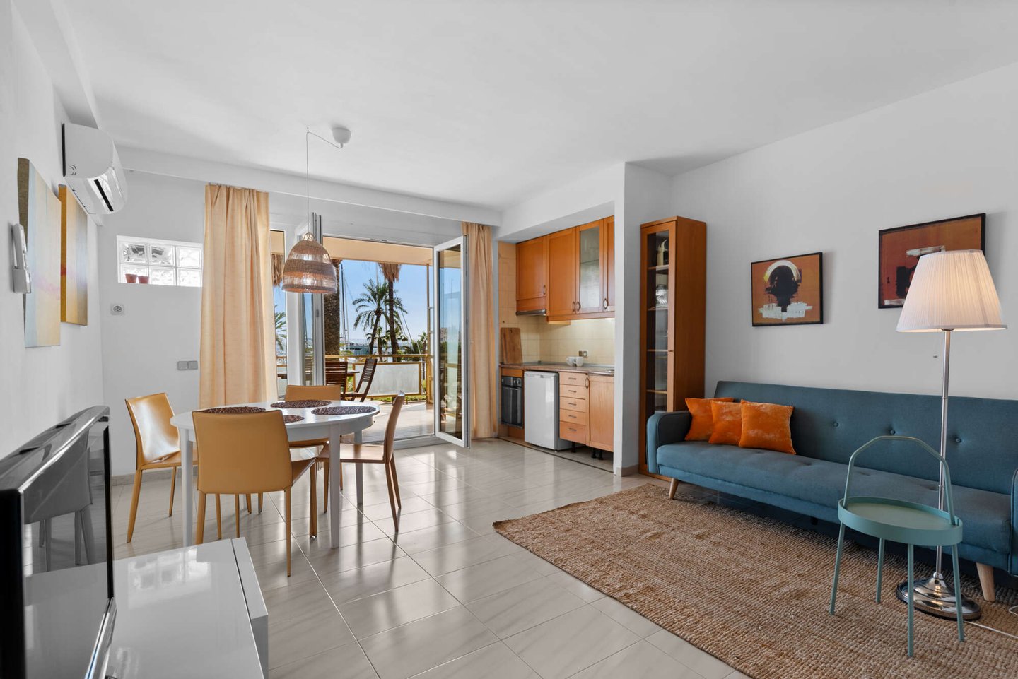 Der offen gestaltete Wohn- und Essbereich mit integrierter Küche wirkt hell und großzügig. Die große Fensterfront führt direkt auf die ca. 15 m² große Terrasse, die den Wohnraum spürbar erweitert und als zweites Wohnzimmer im Freien dient. Von hier genießen Sie einen beeindruckenden Blick auf Yachten, Palmen, das offene Meer und die Silhouette Palmas. Die Süd-Ausrichtung sorgt für optimale Lichtverhältnisse über den gesamten Tag.