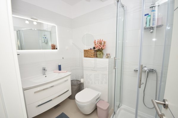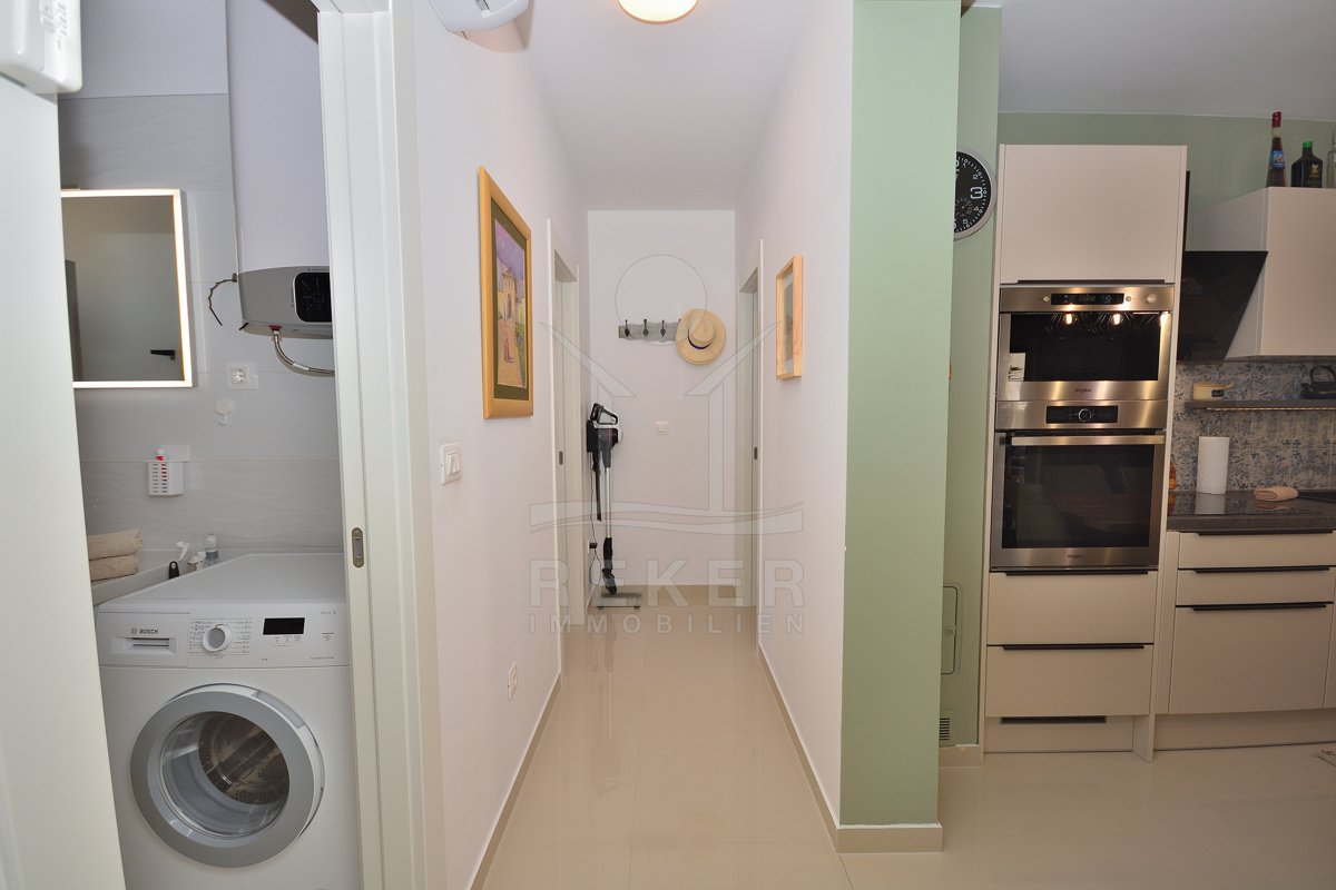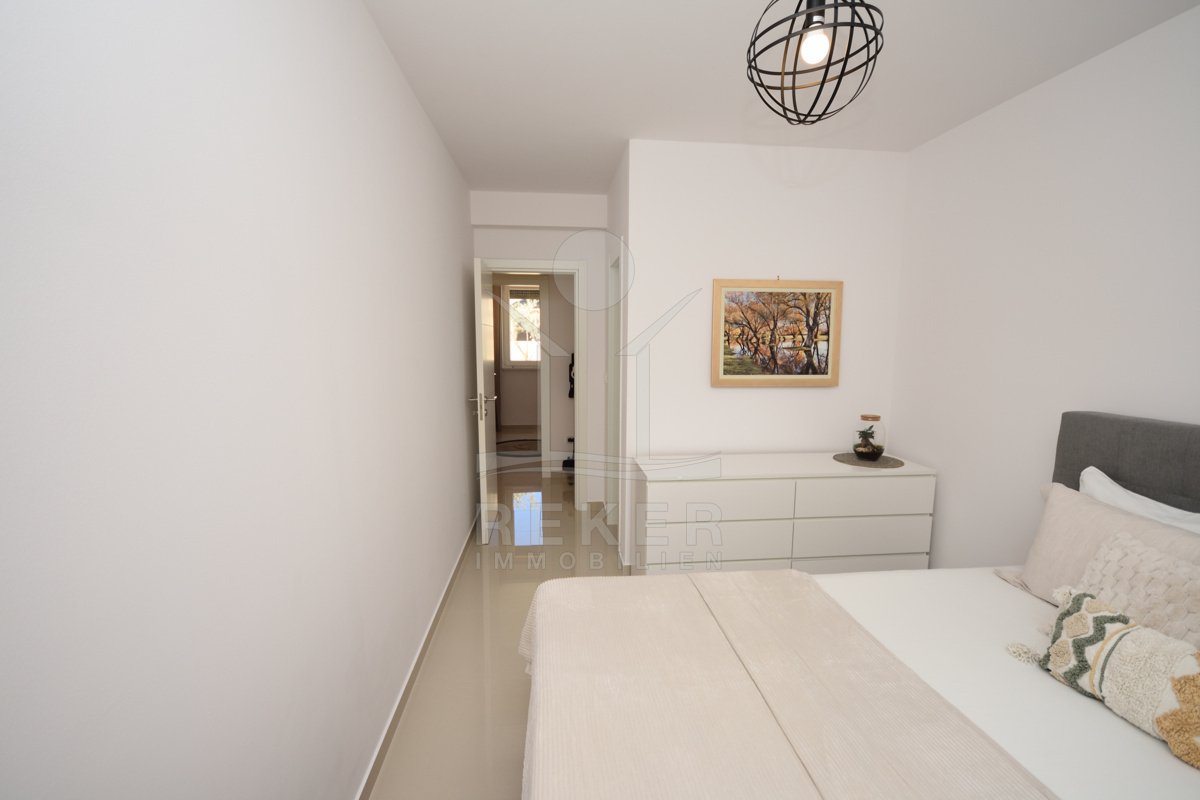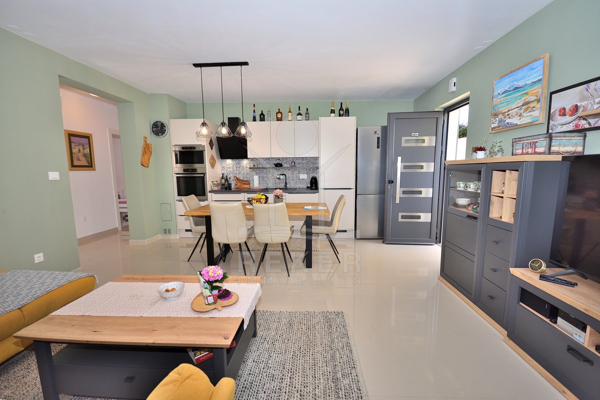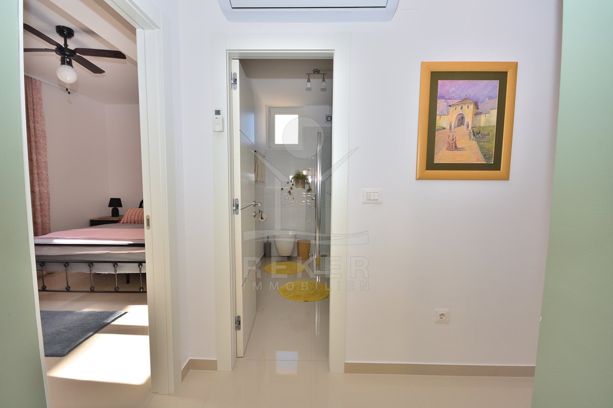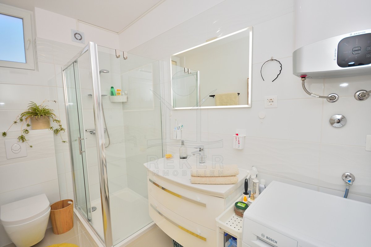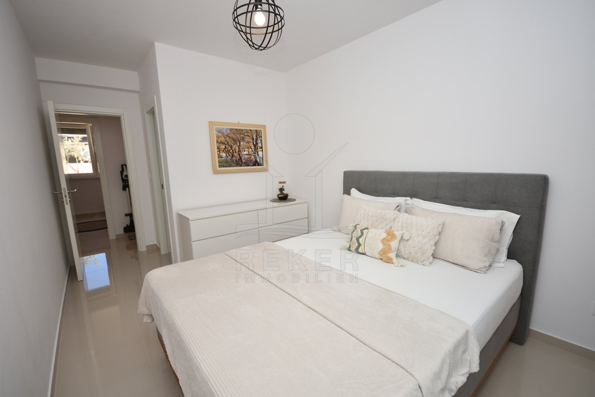 In einem ruhigen, gepflegten Teil von Vodice, nur 500 Meter vom Strand und rund 1.100 Meter vom Zentrum entfernt, erwartet Sie diese komplett möblierte Wohnung aus dem Jahr 2021. Die südwestliche Ausrichtung bringt viel Sonne in die Räume und schafft eine freundliche Atmosphäre. Ihren Parkplatz mit 12,91 m² nutzen Sie direkt am Gebäude. Zusätzlich steht Ihnen ein Kellerraum mit 4,30 m² zur Verfügung. Praktisch für alles, was Sie verstauen möchten.