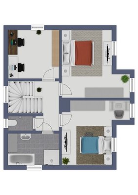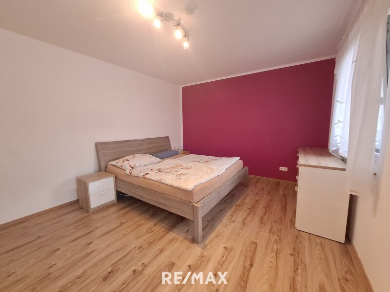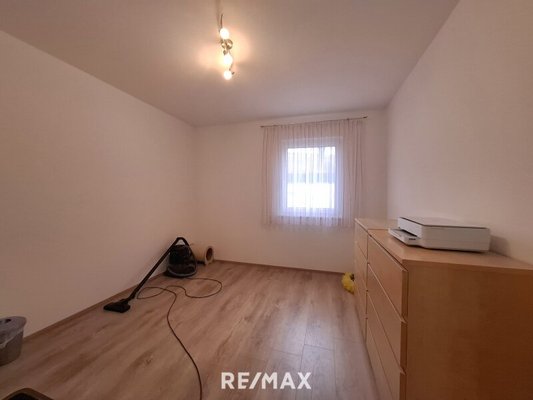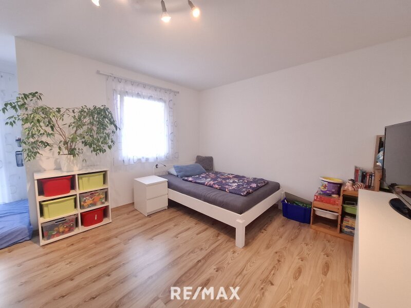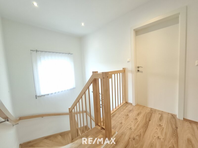 Über eine Holztreppe im hellen Stiegenhaus gelangt man in das Obergeschoss. Dieses gliedert sich in drei Zimmer, die aktuell als Schlafzimmer, Kinderzimmer und Büro genutzt werden.