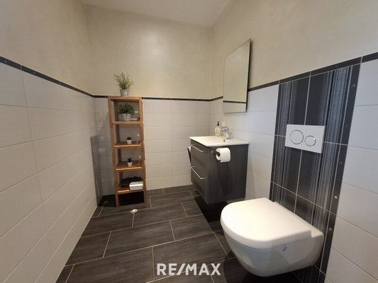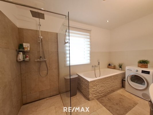 Zusätzlich stehen ein separates WC sowie ein modernes Badezimmer mit Badewanne und großzügiger, ebenerdig begehbarer Dusche zur Verfügung. Die Dusche ist mit einem Regenduschkopf ausgestattet. Das Badezimmer ist mit neutralen Fliesen versehen.
