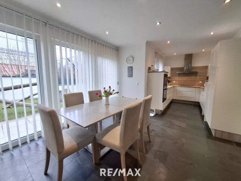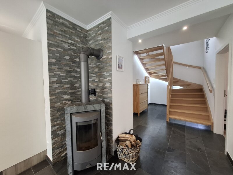 Das Erdgeschoss überzeugt zudem mit einem offenen Wohn- und Essbereich, der direkten Zugang zur Terrasse und in den Garten bietet. Die moderne Einbauküche ist funktional gestaltet und fügt sich harmonisch in das Wohnkonzept ein. Ein Kaminofen im Wohnbereich sorgt in den kühleren Monaten für angenehme Wärme.