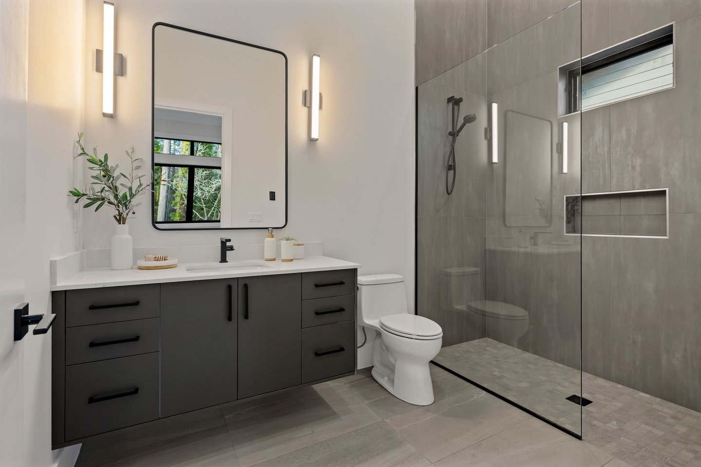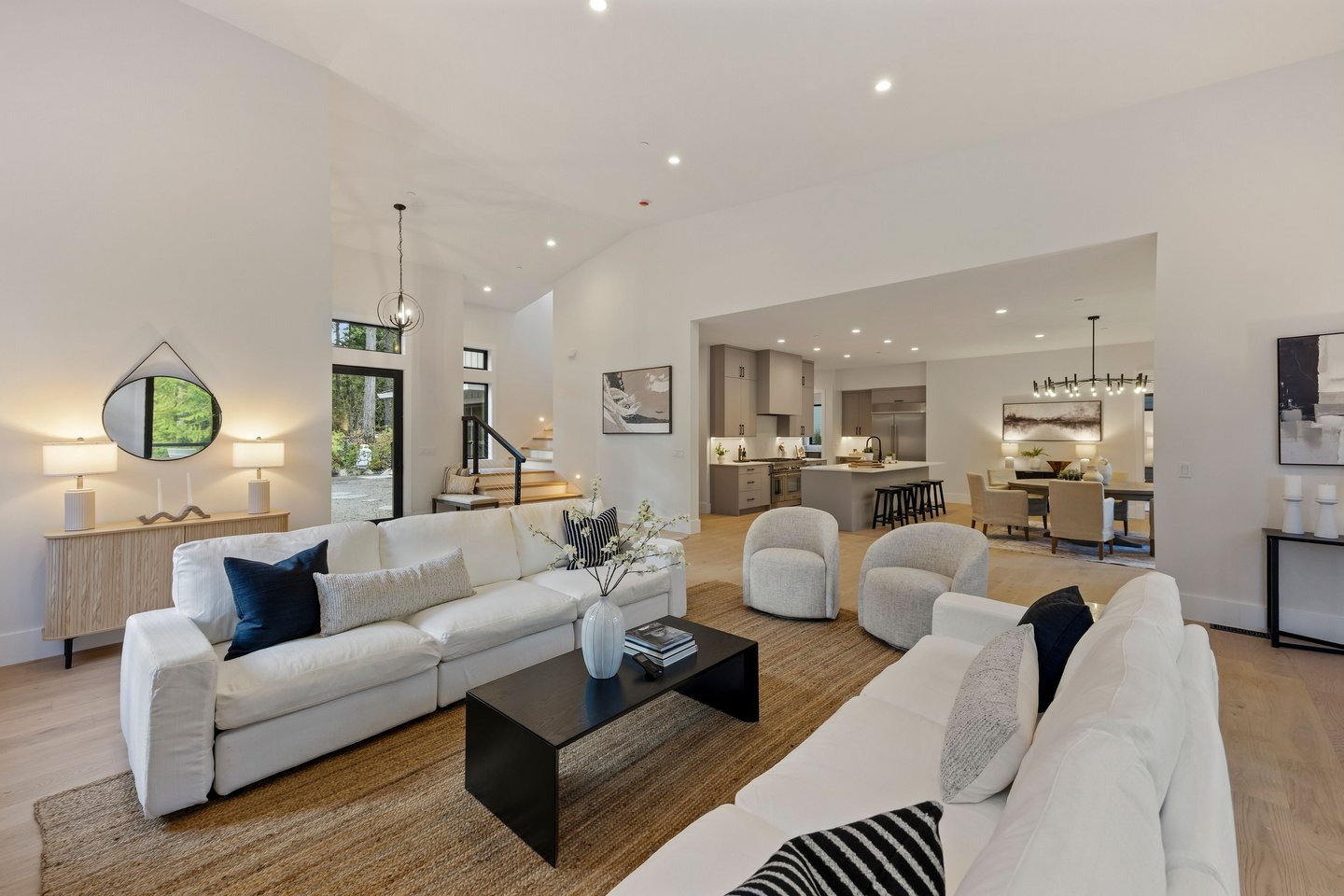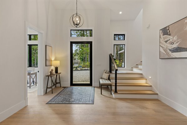 An artful blend of contemporary and traditional architecture, this newly completed residence by Left Coast Development presents 4,317 square feet of refined modern living in the serene Manzanita neighborhood of Bainbridge Island. Set on a private wooded acre with nearby beach access, the home offers both quiet retreat and convenient access to Winslow and the Agate Pass Bridge.