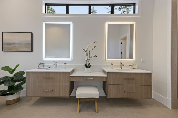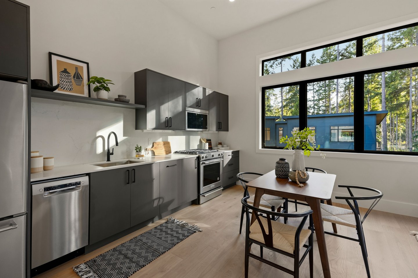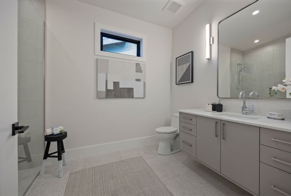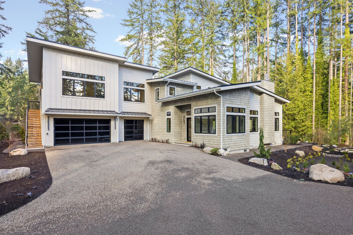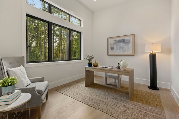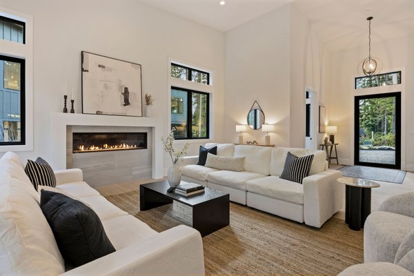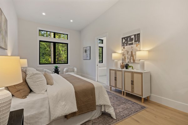 An artful blend of contemporary and traditional architecture, this newly completed residence by Left Coast Development presents 4,317 square feet of refined modern living in the serene Manzanita neighborhood of Bainbridge Island. Set on a private