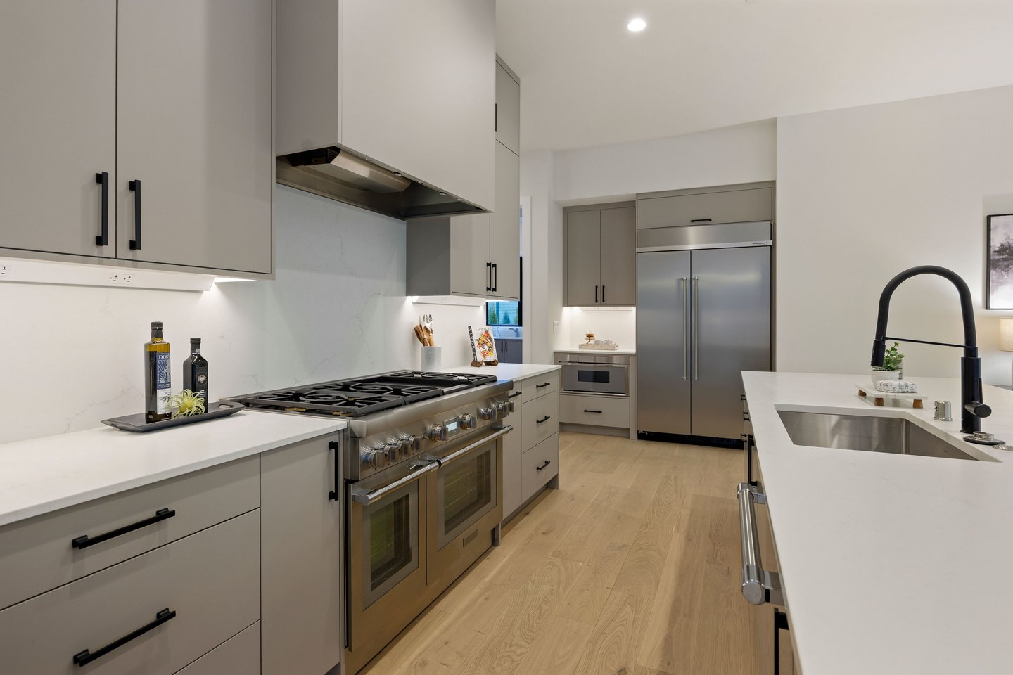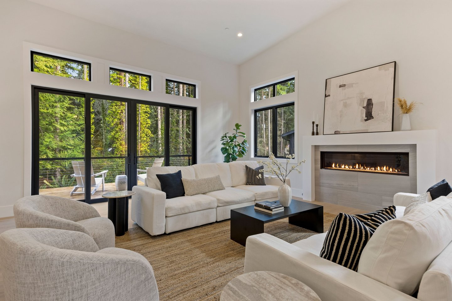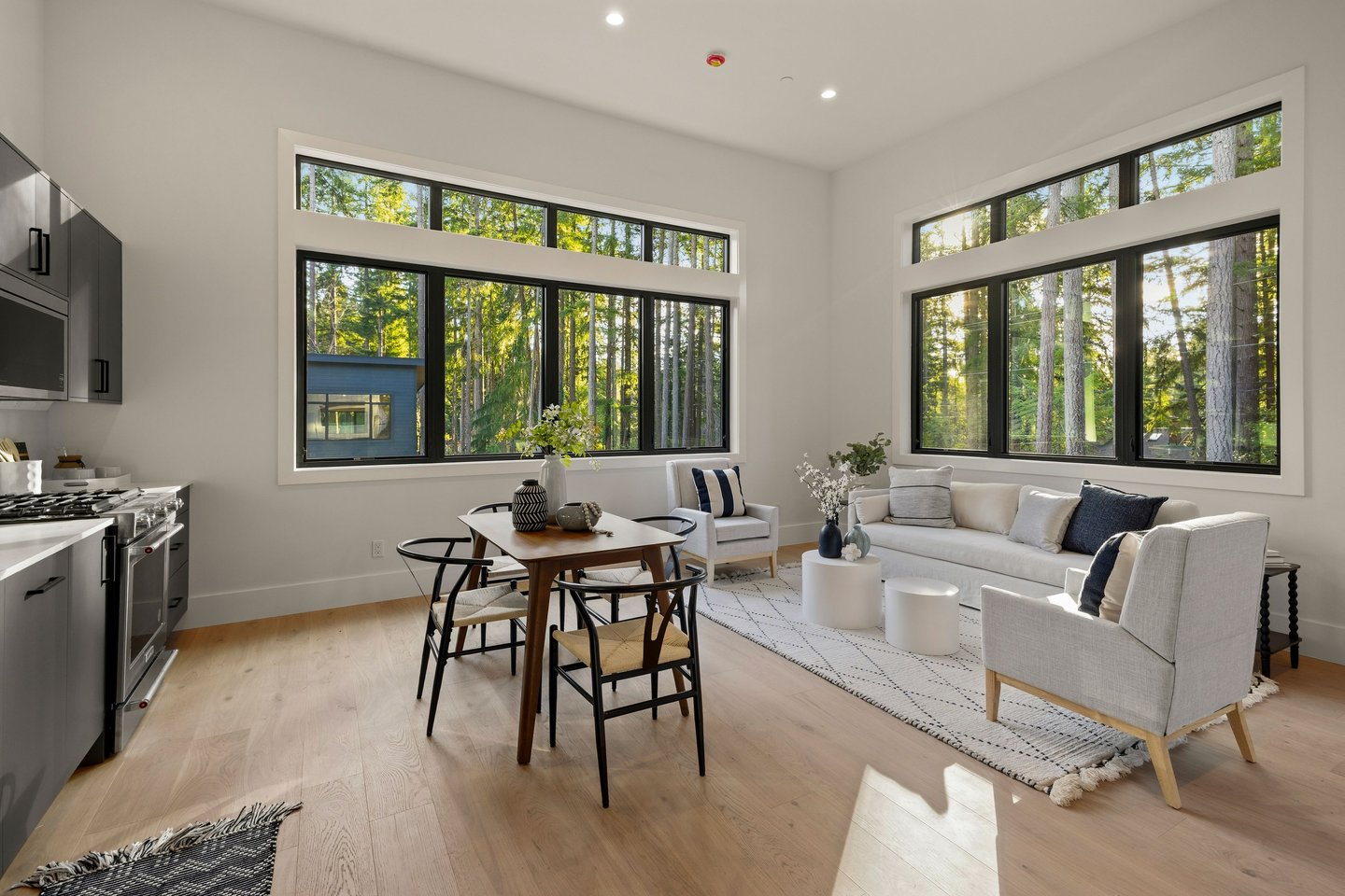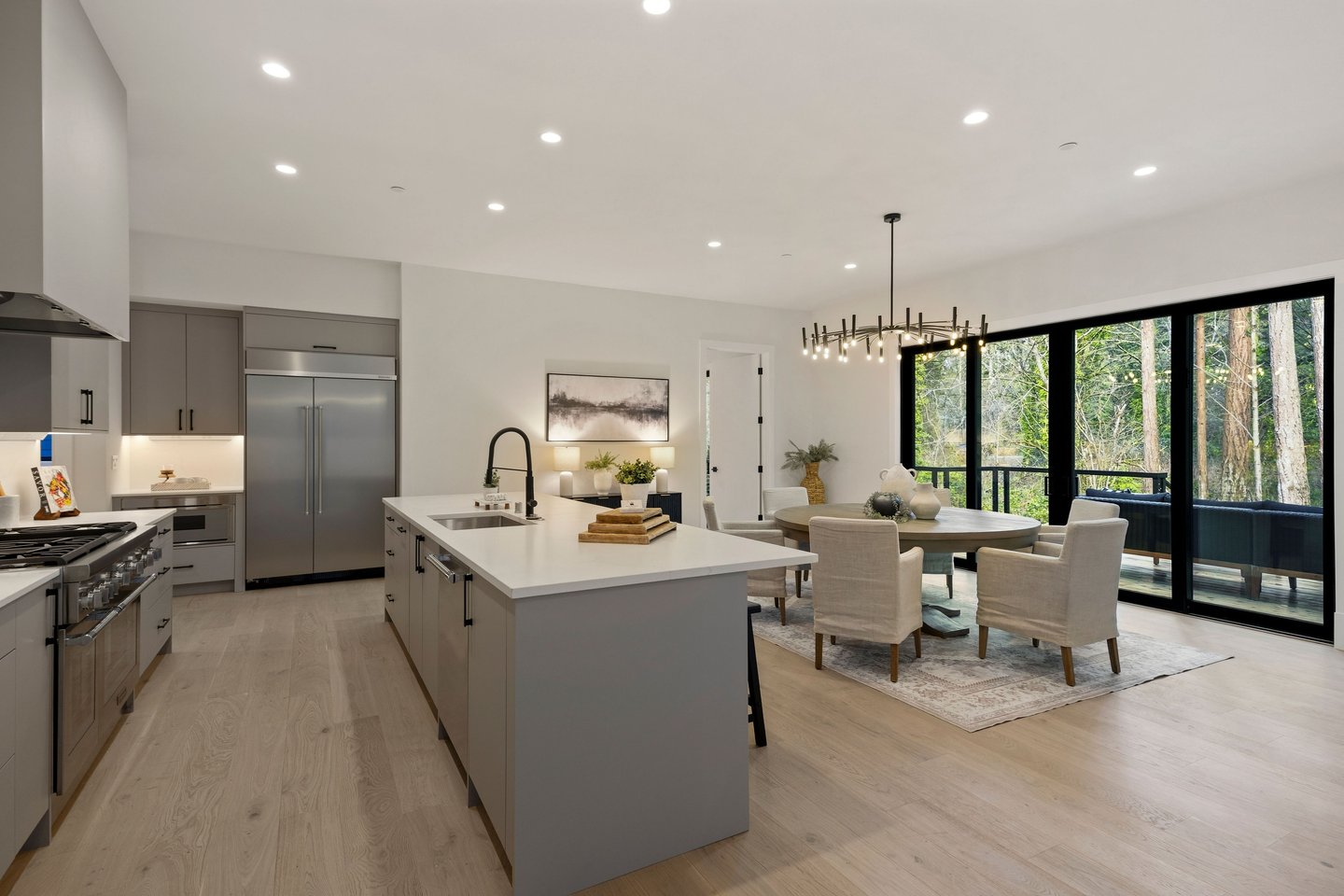 The main level unfolds around a gracious grand room designed for gathering. A chef’s kitchen anchors the space with Bellmont cabinetry, an oversized quartz island with seating, a 48-inch Thermador dual-fuel range, and a butler’s pantry providing discreet storage. Wide plank European oak floors extend throughout, while glass doors open to a large deck framed by wooded surroundings, creating seamless indoor-outdoor flow for entertaining. A propane fireplace adds warmth and architectural presence to the living area.