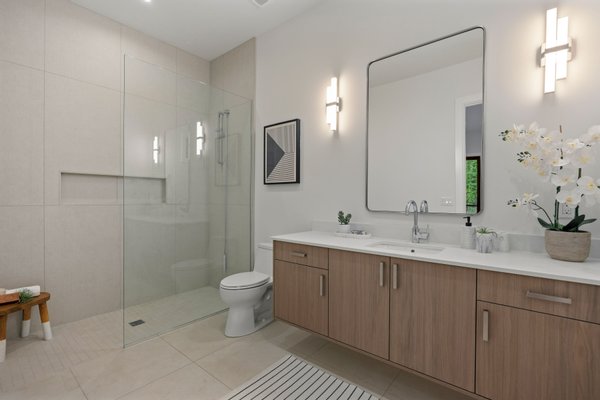 Upstairs, the primary suite serves as a private sanctuary, complete with a walk-in closet and a spa-inspired bath with heated tile floors. Each additional bedroom enjoys its own ensuite three-quarter bath, with heated tile flooring featured in most bathrooms for elevated comfort. A bedroom and two additional upstairs flex rooms provide adaptability for media, fitness, studio, or retreat space.