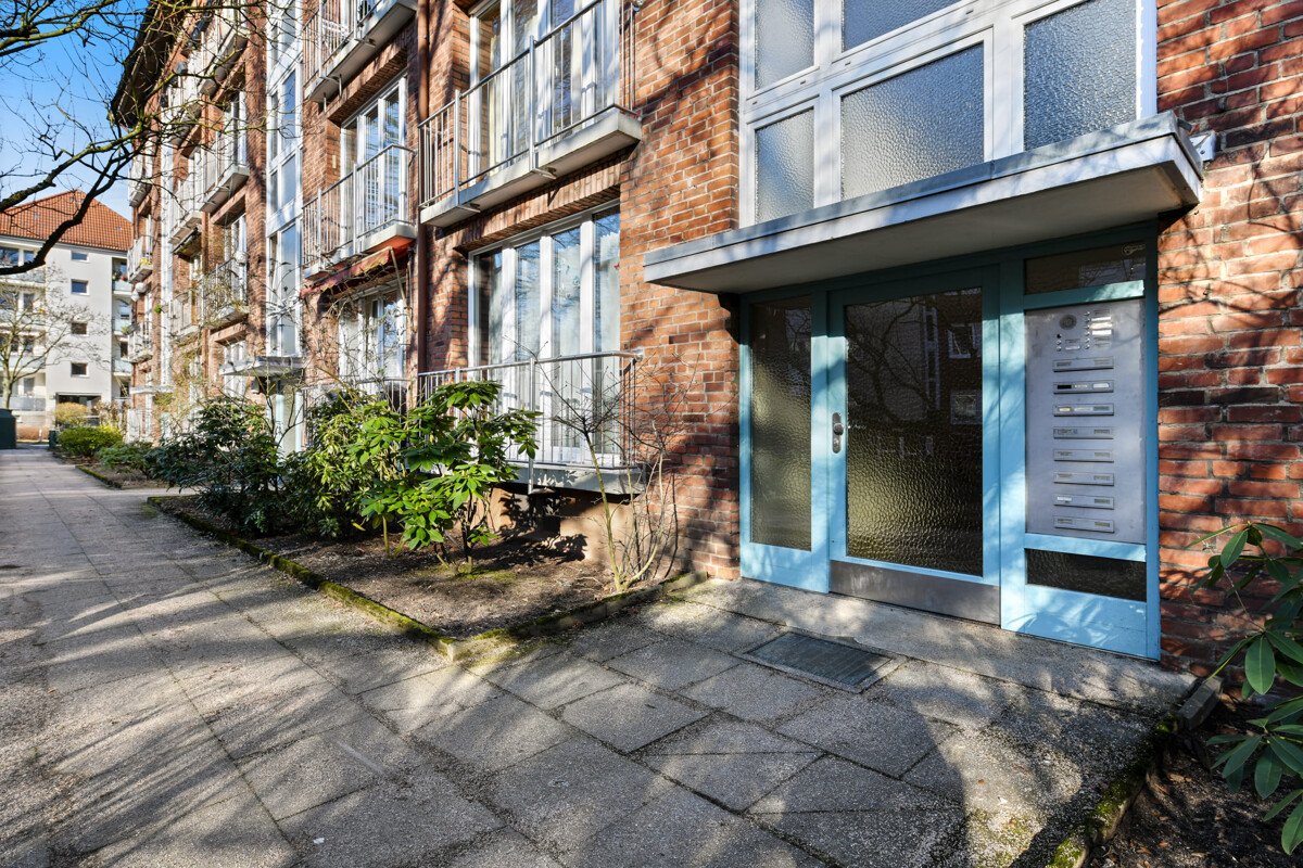 Diese freie Zwei-Zimmer-Wohnung befindet sich in einem gepflegten Mehrfamilienhaus aus dem Jahr 1958 auf einem großzügigen Grundstück von ca. 1.164 m². Das Gebäude erstreckt sich über drei Stockwerke und verfügt über drei separate Eingänge. In jedem Hauseingang befinden sich jeweils acht Wohneinheiten, was eine angenehme, überschaubare Nachbarschaftsstruktur schafft. Beheizt wird die Wohnanlage zuverlässig über Hamburger Fernwärme.