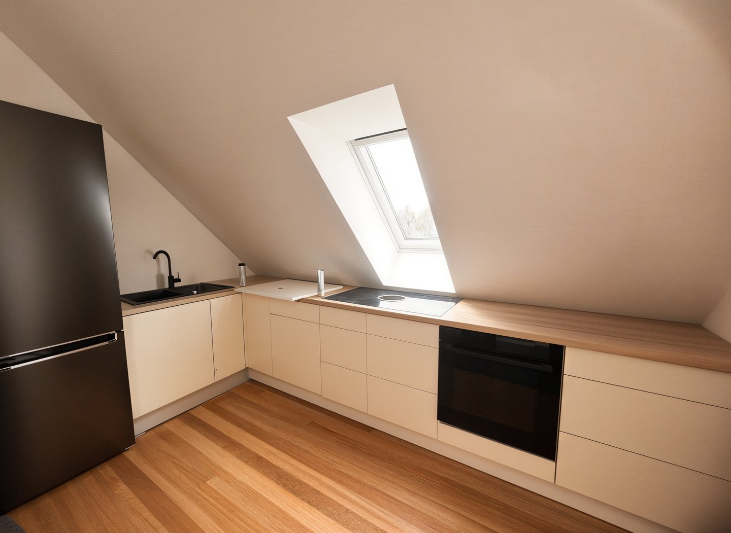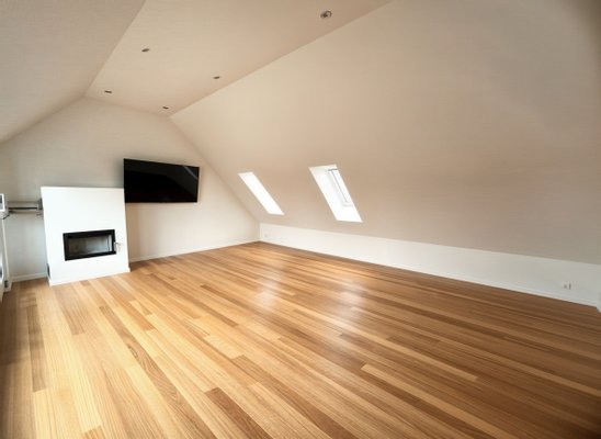 Der Wohnbereich besticht durch einen hochwertigen Eukalyptus-Vollholzboden, einen stilvollen Kamin sowie große Fensterflächen, die für ein lichtdurchflutetes Ambiente sorgen. Von hier aus besteht ein direkter Zugang zur Dachterrasse, die den Wohnraum ideal nach außen erweitert.