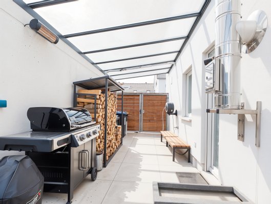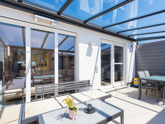 Outdoor-Wohnbereich: Wintergarten, Grillterrasse mit Glasdach & Heizstrahler